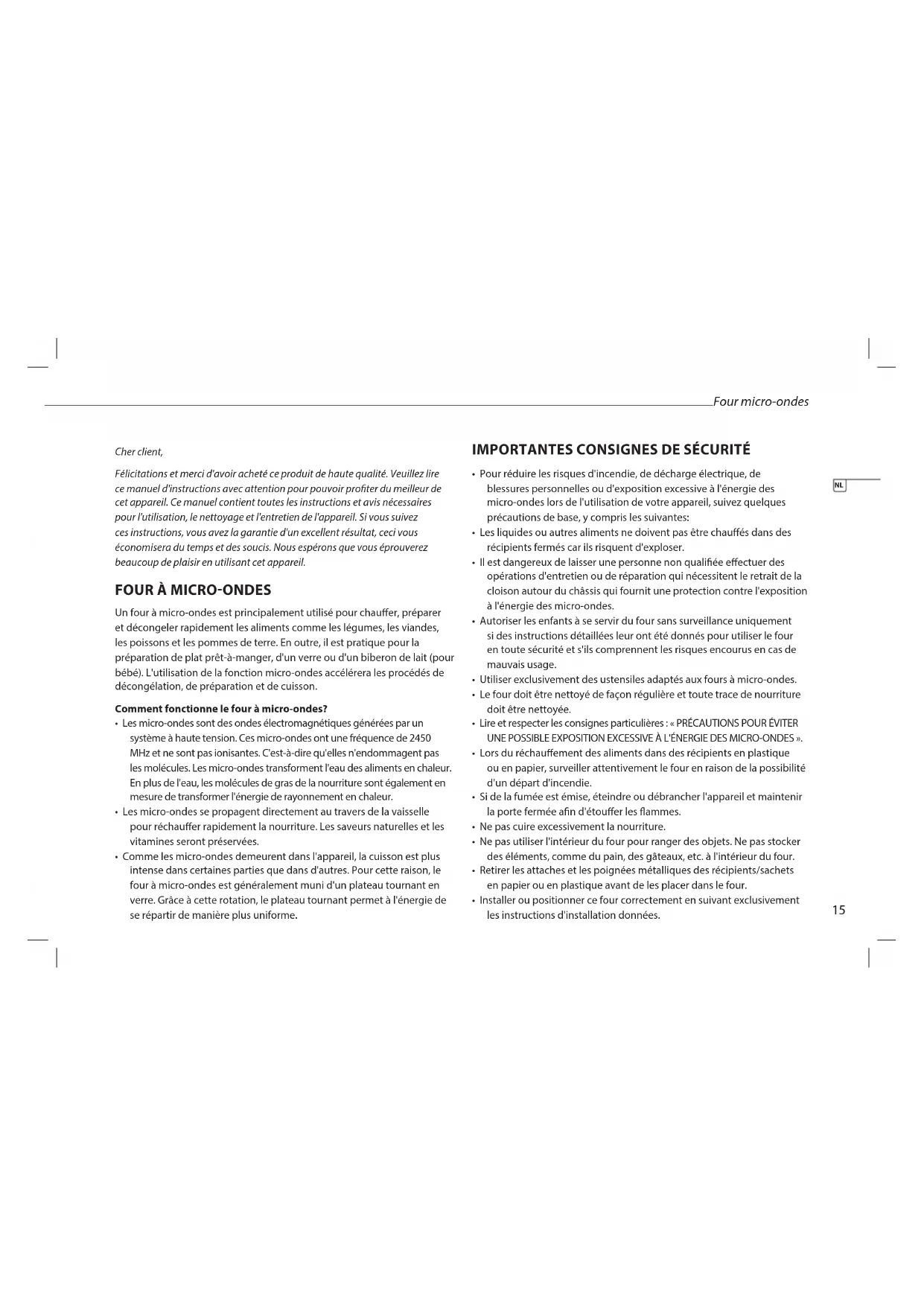 • Lire et respecter les consignes particulières : « PRÉCAUTIONS POUR ÉVITER UNE POSSIBLE EXPOSITION EXCESSIVE À L'ÉNERGIE DES MICRO-ONDES ».