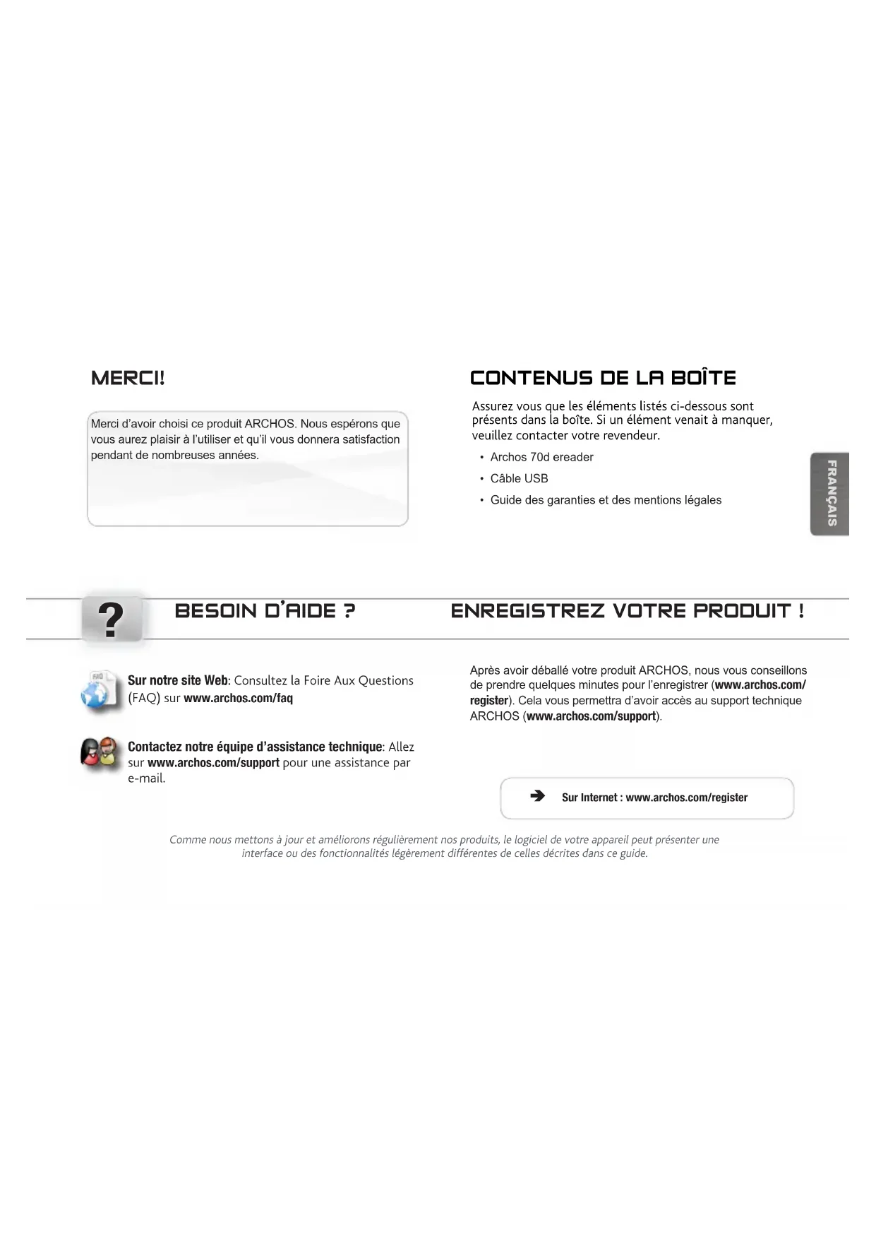 Merci d’avoir choisi ce produit ARCHOS. Nous espérons que vous aurez plaisir à l’utiliser et qu’il vous donnera satisfaction pendant de nombreuses années. MERCI!