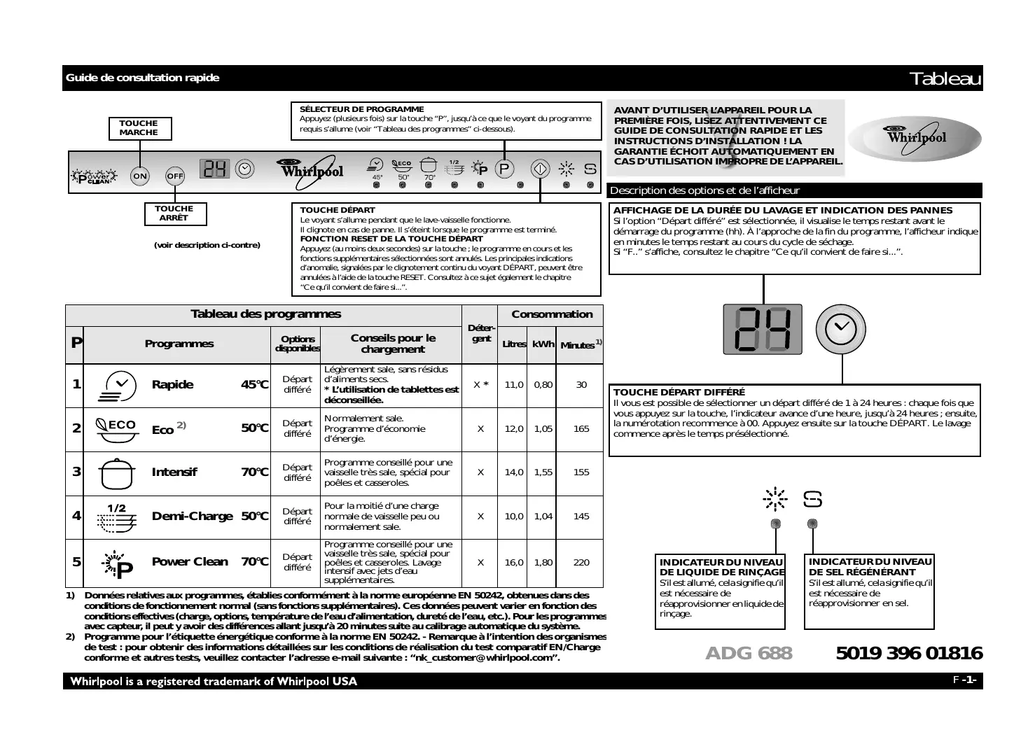 ADG 688 FD - TABLEAU DE PROGRAMMES - Lave-vaisselle WHIRLPOOL - Notice d'utilisation et mode d'emploi gratuit