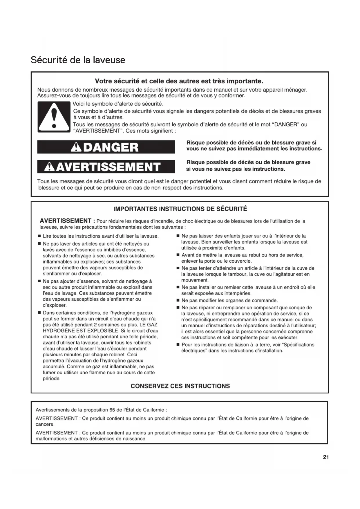 clignote à nouveau à la n d’un programme de lavage en guise de rappel. Entretien de la laveuse33 Faire fonctionner la laveuse seulement lorsqu’on est présent. En cas de déménagement ou si l’on n’utilise pas la laveuse pendant longtemps, suivre les étapes suivantes :