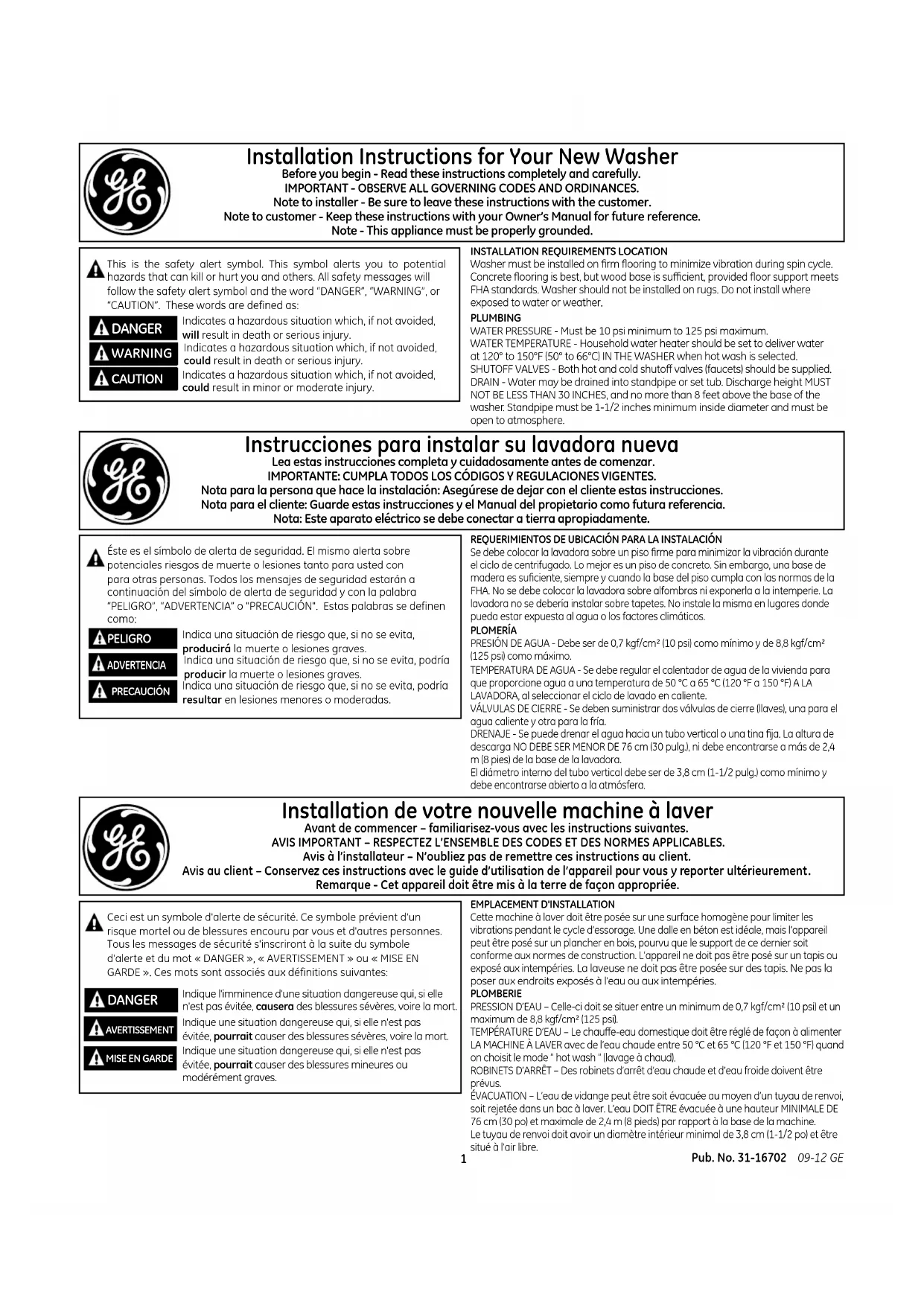 EMPLACEMENT D'INSTALLATIONCette machine à laver doit être posée sur une surface homogène pour limiter les vibrations pendant le cycle d’essorage. Une dalle en béton est idéale, mais l’appareil peut être posé sur un plancher en bois, pourvu que le support de ce dernier soit conforme aux normes de construction. L’appareil ne doit pas être posé sur un tapis ou exposé aux intempéries. La laveuse ne doit pas être posée sur des tapis. Ne pas la poser aux endroits exposés à l'eau ou aux intempéries. Pub. No. 31-16702 09-12 GE INSTALLATION REQUIREMENTS LOCATION:DVKHUPXVWEHLQVWDOOHGRQ¿UPÀRRULQJWRPLQLPL]HYLEUDWLRQGXULQJVSLQF\FOH&RQFUHWHÀRRULQJLVEHVWEXWZRRGEDVHLVVXȻFLHQWSURYLGHGÀRRUVXSSRUWPHHWV)+$VWDQGDUGV:DVKHUVKRXOGQRWEHLQVWDOOHGRQUXJV'RQRWLQVWDOOZKHUHH[SRVHGWRZDWHURUZHDWKHUPLUMBINGWATER PRESSURE - Must be 10 psi minimum to 125 psi maximum.:$7(57(03(5$785(+RXVHKROGZDWHUKHDWHUVKRXOGEHVHWWRGHOLYHUZDWHUDWWR)WR&,17+(:$6+(5ZKHQKRWZDVKLVVHOHFWHG6+872))9$/9(6%RWKKRWDQGFROGVKXWRȺYDOYHVIDXFHWVVKRXOGEHVXSSOLHGDRAIN - Water may be drained into standpipe or set tub. Discharge height MUST NOT BE LESS THAN 30 INCHES, and no more than 8 feet above the base of the ZDVKHU Standpipe must be 1-1/2 inches minimum inside diameter and must be open to atmosphere. Installation de votre nouvelle machine à laver