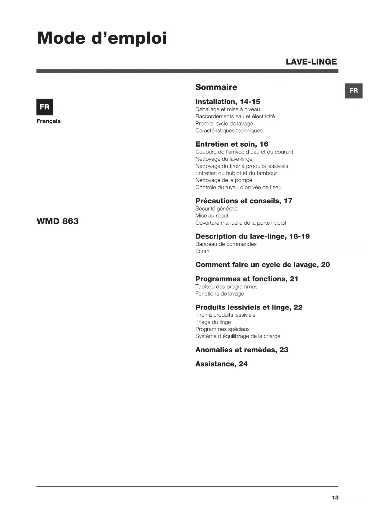 WMD 863 - Machine à laver HOTPOINT - Notice d'utilisation et mode d'emploi gratuit