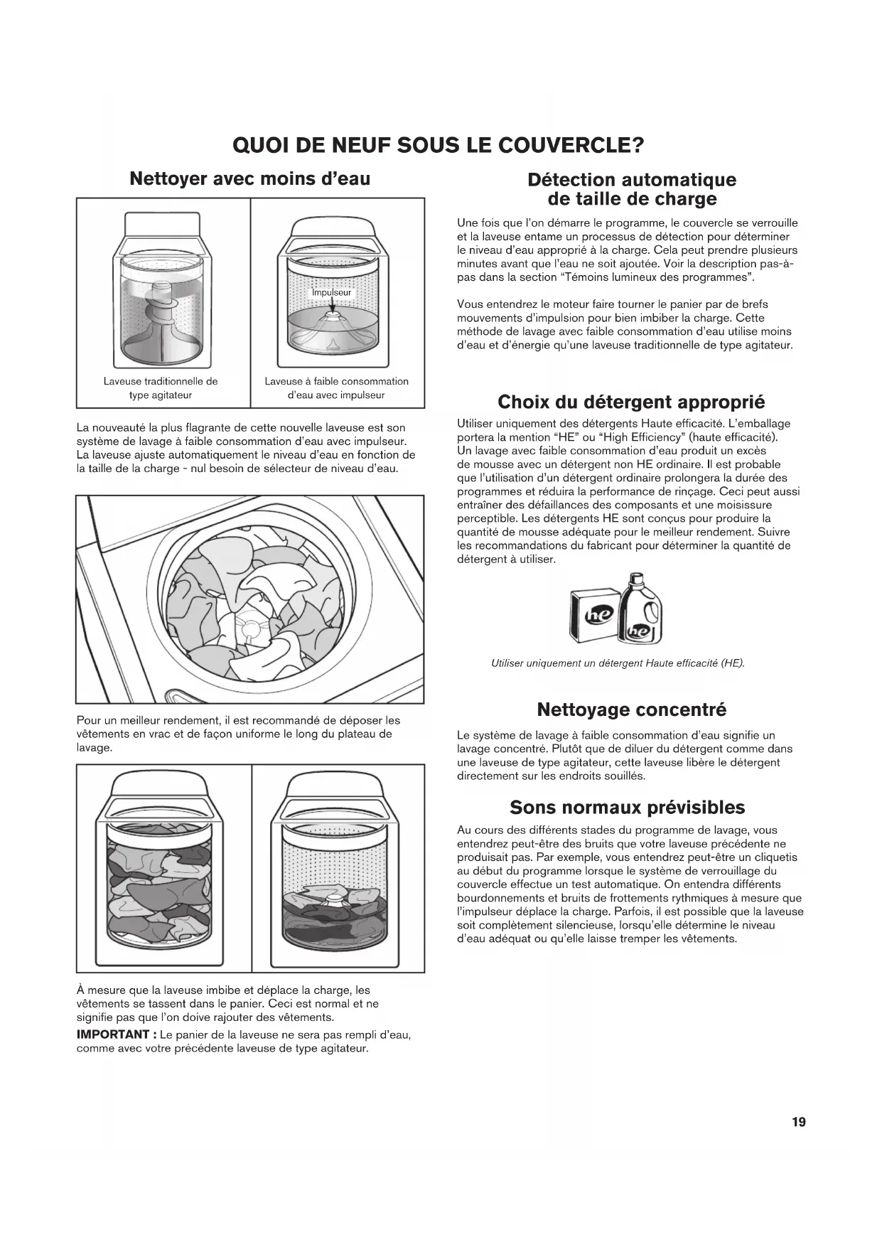 Utiliser uniquement un détergent Haute efficacité (HE). QUOI DE NEUF SOUS LE COUVERCLE? Choix du détergent approprié Utiliser uniquement des détergents Haute efficacité. L’emballage portera la mention “HE” ou “High Efficiency” (haute efficacité). Un lavage avec faible consommation d’eau produit un excès de mousse avec un détergent non HE ordinaire. Il est probable que l’utilisation d’un détergent ordinaire prolongera la durée des programmes et réduira la performance de rinçage. Ceci peut aussi entraîner des défaillances des composants et une moisissure perceptible. Les détergents HE sont conçus pour produire la quantité de mousse adéquate pour le meilleur rendement. Suivre les recommandations du fabricant pour déterminer la quantité de détergent à utiliser. Sons normaux prévisibles Au cours des différents stades du programme de lavage, vous entendrez peut-être des bruits que votre laveuse précédente ne produisait pas. Par exemple, vous entendrez peut-être un cliquetis au début du programme lorsque le système de verrouillage du couvercle effectue un test automatique. On entendra différents bourdonnements et bruits de frottements rythmiques à mesure que l’impulseur déplace la charge. Parfois, il est possible que la laveuse soit complètement silencieuse, lorsqu’elle détermine le niveau d’eau adéquat ou qu’elle laisse tremper les vêtements. Nettoyage concentré Le système de lavage à faible consommation d’eau signifie un lavage concentré. Plutôt que de diluer du détergent comme dans une laveuse de type agitateur, cette laveuse libère le détergent directement sur les endroits souillés. Nettoyer avec moins d’eau La nouveauté la plus flagrante de cette nouvelle laveuse est son système de lavage à faible consommation d’eau avec impulseur. La laveuse ajuste automatiquement le niveau d’eau en fonction de la taille de la charge - nul besoin de sélecteur de niveau d’eau. Laveuse traditionnelle de type agitateur Laveuse à faible consommation d’eau avec impulseur Impulseur Détection automatique de taille de charge Une fois que l’on démarre le programme, le couvercle se verrouille et la laveuse entame un processus de détection pour déterminer le niveau d’eau approprié à la charge. Cela peut prendre plusieurs minutes avant que l’eau ne soit ajoutée. Voir la description pas-à- pas dans la section “Témoins lumineux des programmes”. Vous entendrez le moteur faire tourner le panier par de brefs mouvements d’impulsion pour bien imbiber la charge. Cette méthode de lavage avec faible consommation d’eau utilise moins d’eau et d’énergie qu’une laveuse traditionnelle de type agitateur. À mesure que la laveuse imbibe et déplace la charge, les vêtements se tassent dans le panier. Ceci est normal et ne signifie pas que l’on doive rajouter des vêtements. IMPORTANT : Le panier de la laveuse ne sera pas rempli d’eau, comme avec votre précédente laveuse de type agitateur. Pour un meilleur rendement, il est recommandé de déposer les vêtements en vrac et de façon uniforme le long du plateau de lavage.20