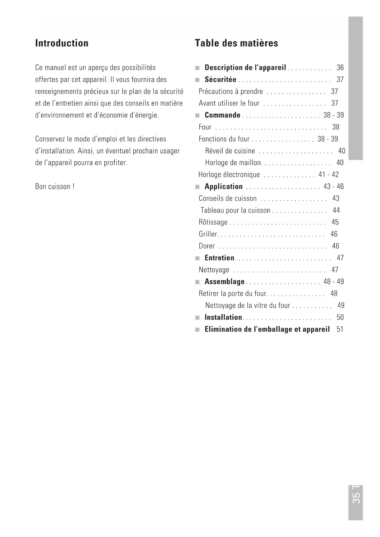 - Préchauffer le four (utilisez 10 minutes de moins qu’indiqué).45 APPLICATION Rôtissage De la viande cuite dans un récipient avec couvercle se dessèche moins. De plus, l’utilisation du couvercle permet de réduire ou d’empêcher la formation de fumée. La viande cuite dans un récipient sans couvercle ou au four brunit plus vite et le dessus se dessèche plus rapidement. Le plat lèchefrite est idéal pour la cuisson de morceaux de viande plus grande. Vous ne pouvez vous référer aux chiffres indiqués dans ce tableau que pour la cuisson des aliments sans préchauffage. En cuisson traditionnelle, placer les plats sur le 2ème gradin. Tableau pour la cuisson de viandes Plat poids en kg temp en °C temps de cuisson Viande de porc 1,0 180 - 200 100 Viande de boeuf 1,0 170 - 190 100 Veau 1,0 170 - 190 90 Poulet 1,0 180 - 200 60 Poule 1,3 170 - 190 75 Canard 1,5 150 - 170 90 Cuissot de chevreui 1,5 170 - 190 90 Gigot et sanglier 1,5 160 - 180 120 Poisson (complet) 1,0 160 - 180 50 Les chiffres indiqués dans ce tableau sont donnés à titre indicatif.46 Griller ■ Glisser le lèchefrite dans le bas du four (premières glissières). ■ Déposer votre grillade au milieu de la grille (voir tableau). ■ Fermer la porte du four et régler le bouton sur gril. Les viandes rouges, boeuf, gibier et agneau, sont saisies plus rapidement que les viandes blanches, veau, porc et volailles. La viande blanche et les filets de poissons ont une croûte moins dorée, tout en étant cuit à point. La cuisson des grillades, posées à même la grille, provoque souvent une formation de fumée, provenant de la graisse tombée sur le fond du four. Remplir le lèchefrite d’eau et le glisser en dessous de la grille peut diminuer la fumée, mais augmente par contre la formation de buée. Faire dorer les aliments Pour faire dorer le dessus de vos aliments, mettre le four en position gril pendant quelques minutes. Attendez jusqu’à ce que le dessus du mets soit bien saisi ; tourner le mets sans le piquer. Petites grillades La viande grillée garde ses arômes naturels si on ne la graisse pas avant la cuisson. Gros morceaux de viande Pour éviter que les parties directement exposées à la chaleur ne se dessèchent, verser un peu d’huile ou poser quelques noisettes de beurre sur la viande. Tableau de cuisson au gril Plat gradin a partir temps de cuisson du bas en minutes Bifteck (4 morceaux) 3 ou 4 5 - 6 Escalope (4 morceaux) 3 ou 4 6 - 8 Foie (4 morceaux) 3 ou 4 4 - 5 Boulettes de hachis (4 morceaux) 3 ou 4 7 - 9 Saucisses (4 morceaux) 3 ou 4 5 - 6 Toast 3 ou 4 2 - 3 Les chiffres indiqués dans ce tableau sont donnés à titre indicatif. APPLICATION47 ENTRETIEN Nettoyage Parties émaillées L’intérieur de la porte du four, les parois latérales, la sole et la plaque à pâtisserie sont en émail. Nous vous conseillons de les nettoyer dans une eau savonneuse chaude, ou éventuelle ment avec un produit d’entretien et de les rincer à l’eau claire. Parties en chrome Nettoyer les gradins, la grille du four et le tableau de commande dans une eau savonneuse chaude ou avec du savon liquide et les rincer à l’eau claire. Plastique / verre Nettoyer la poignée et les boutons dans une eau savonneuse. Joint de porte Nettoyer le joint de porte dans une eau savonneuse chaude et le rincer à l’eau claire. Conseil Pour éviter l’apparition de taches difficiles à éliminer, nettoyer régulièrement votre four. Pour nettoyer le four à fond, enlever les glissières.48 ASSEMBLAGE Retirer et placer la porte du four Retirer la porte du four - Ouvrez complètement la porte du four. - Faites passer la cheville de sécurité fournie par le trou dans la charnière. - Saisissez la porte du four avec les deux mains et fermez-la presque complètement. - Levez un peu la porte et ôtez les charnières de l’ouverture. Attention! – danger de blessure Ne retirez pas la cheville de sécurité de la charnière. La charnière est sous tension de ressort. La charnière doit être tendue pour pouvoir replacer la porte du four. Après avoir retiré la cheville de sécurité il n’est plus possible de tendre manuellement la charnière et de placer la cheville de sécurité. Placer la porte du four - Saisissez la porte du four avec les deux mains et faites glisser les charnières dans les ouvertures. Les charnières se fixent en se cliquant. - Ouvrez lentement et complètement la porte du four. - Retirez la cheville de sécurité de la charnière. - Fermez la porte du four.49 ASSEMBLAGE Nettoyage de la vitre du four Enlevez la vitre du four - Ouvrez la porte du four complètement. - Tirez la vitre depuis l’arrière vers le haut (A). - Vous pouvez maintenant ôter la vitre du four. Attention : La porte du four se referme après que la vitre du four est enlevée. - Nettoyez la vitre du four et la face intérieure de la porte du four. Placez la vitre du four - Placez les guides de la vitre du four dans les fentes (B) à l’avant de la porte du four (lorsque celle-ci est ouverte). - Placez la vitre du four dans la porte du four (C). - Insérez les guides arrière de la vitre en poussant (D) et fixez la vitre dans la porte du four (E).