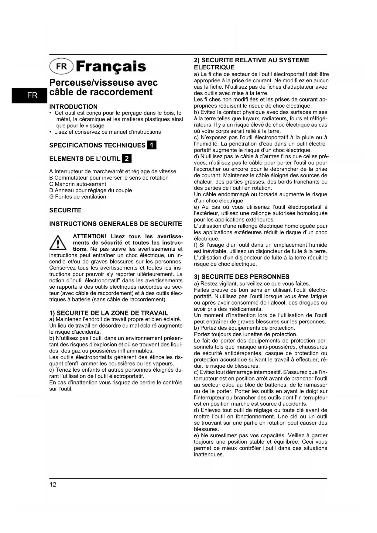 A Interrupteur de marche/arrêt et réglage de vitesse B Commutateur pour inverser le sens de rotation C Mandrin auto-serrant D Anneau pour réglage du couple G Fentes de ventilation SECURITE