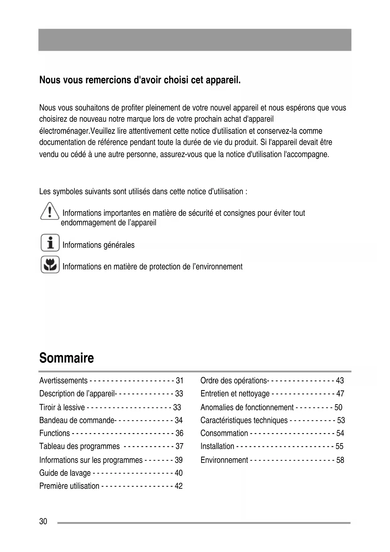 a tap with a 3/4” thread. Always use the hose supplied with the appliance. 45° 35° The inlet hose must not be lengthened. If it is too short and you do not wish to move the tap, you will have to purchase a new, longer hose specially designed for this type of use. Water drainage The end of the drain hose can be positioned in three ways: Hooked over the edge of a sink using the plastic hose guide supplied with the machine. In this case, make sure the end cannot come unhooked when the machine is emptying. This could be done by tying it to the tap with a piece of string or attaching it to the wall. In a sink drain pipe branch. This branch must be above the trap so that the bend is at least 60 cm above the ground. Directly into a drain pipe at a height of not less than 60 cm and not more than 90 cm. The end of the drain hose must always be ventilated, i.e. the inside diameter of the drain pipe must be larger than the outside diameter of the drain hose. The drain hose must not be kinked. 192997920_GB.qxd 14/12/2007 17.09 Pagina 2627 Electrical connection This machine is designed to operate on a 230 V, single-phase, 50 Hz supply. Check that your domestic electrical installation can take the maximum load required (2.2 kW), also taking into account any other appliances in use. Attention! Connect the machine to an earthed socket. The manufacturer declines any responsibility for damage or injury through failure to comply with the above safety precaution. Should the appliance power supply cable need to be replaced, this should be carried out by our Service Centre. NOTE Please ensure that when the appliance is installed it is easily accessible for the engineer in the event of a breakdown. 192997920_GB.qxd 14/12/2007 17.09 Pagina 2728 Environmental concerns Packaging materials The materials marked with the symbol are recyclable. >PE<=polyethylene >PS<=polystyrene >PP<=polypropylene This means that they can be recycled by disposing of them properly in appropriate collection containers. Old machine Use authorised disposal sites for your old appliance. Help to keep your country tidy! The symbol on the product or on its packaging indicates that this product may not be treated as household waste. Instead it shall be handed over to the applicable collection point for the recycling of electrical and electronic equipment. By ensuring this product is disposed of correctly, you will help prevent potential negative consequences for the environment and human health, which could otherwise be caused by inappropriate waste handling of this product. For more detailed information about recycling of this product, please contact your local city office, your household waste disposal service or the shop where you purchased the product. Ecological hints To save water, energy and to help protect the environment, we recommend that you follow these tips: ● Normally soiled laundry may be washed without prewashing in order to save detergent, water and time (the environment is protected too!). ● The machine works more economically if it is fully loaded. ● With adequate pre-treatment, stains and limited soiling can be removed; the laundry can then be washed at a lower temperature. ● Measure out detergent according to the water hardness, the degree of soiling and the quantity of laundry being washed. 192997920_GB.qxd 14/12/2007 17.09 Pagina 2829 192997920_GB.qxd 14/12/2007 17.09 Pagina 2930 Sommaire Avertissements - - - - - - - - - - - - - - - - - - - - 31 Description de l’appareil- - - - - - - - - - - - - - 33 Tiroir à lessive - - - - - - - - - - - - - - - - - - - - 33 Bandeau de commande- - - - - - - - - - - - - - 34 Functions - - - - - - - - - - - - - - - - - - - - - - - - 36 Tableau des programmes - - - - - - - - - - - - 37 Informations sur les programmes - - - - - - - 39 Guide de lavage - - - - - - - - - - - - - - - - - - - 40 Première utilisation - - - - - - - - - - - - - - - - - 42 Ordre des opérations- - - - - - - - - - - - - - - - 43 Entretien et nettoyage - - - - - - - - - - - - - - - 47 Anomalies de fonctionnement - - - - - - - - - 50 Caractéristiques techniques - - - - - - - - - - - 53 Consommation - - - - - - - - - - - - - - - - - - - - 54 Installation - - - - - - - - - - - - - - - - - - - - - - - 55 Environnement - - - - - - - - - - - - - - - - - - - - 58 Nous vous remercions d'avoir choisi cet appareil. Nous vous souhaitons de profiter pleinement de votre nouvel appareil et nous espérons que vous choisirez de nouveau notre marque lors de votre prochain achat d'appareil électroménager.Veuillez lire attentivement cette notice d'utilisation et conservez-la comme documentation de référence pendant toute la durée de vie du produit. Si l'appareil devait être vendu ou cédé à une autre personne, assurez-vous que la notice d'utilisation l'accompagne. Les symboles suivants sont utilisés dans cette notice d’utilisation : Informations importantes en matière de sécurité et consignes pour éviter tout endommagement de l’appareil Informations générales Informations en matière de protection de l’environnement 192997920_FR.qxd 14/12/2007 17.06 Pagina 3031 Avertissements Ces avertissements ont été rédigés pour votre sécurité et celle d’autrui. Veuillez les lire attentivement avant d’installer et d’utiliser l’appareil. Nous vous remercions de votre attention. Conservez cette notice d’utilisation. En cas de revente ou de cession à une autre personne, la notice d’utilisation doit accompagner l’appareil. Le nouvel utilisateur pourra se familiariser avec les fonctions du lave-linge et les avertissements liés à son utilisation. Avertissements généraux ● Ne modifiez pas et ne tentez pas de modifier les caractéristiques de cet appareil. Un tel comportement peut mettre l’utilisateur en danger. ● Videz les poches des vêtements avant le lavage en enlevant tout objet tel que pièces de monnaie, épingles à nourrice, broches, vis, susceptibles de provoquer des dommages. 