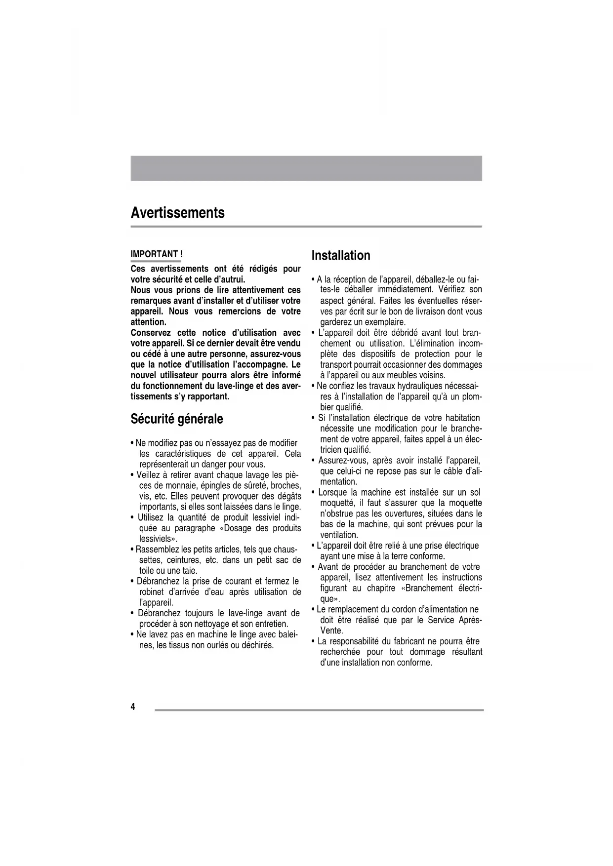- Garantie Avertissements IMPORTANT ! Ces avertissements ont été rédigés pour votre sécurité et celle d’autrui. Nous vous prions de lire attentivement ces remarques avant d’installer et d’utiliser votre appareil. Nous vous remercions de votre attention. Conservez cette notice d’utilisation avec votre appareil. Si ce dernier devait être vendu ou cédé à une autre personne, assurez-vous que la notice d’utilisation l’accompagne. Le nouvel utilisateur pourra alors être informé du fonctionnement du lave-linge et des aver- tissements s’y rapportant. Sécurité générale p. 254