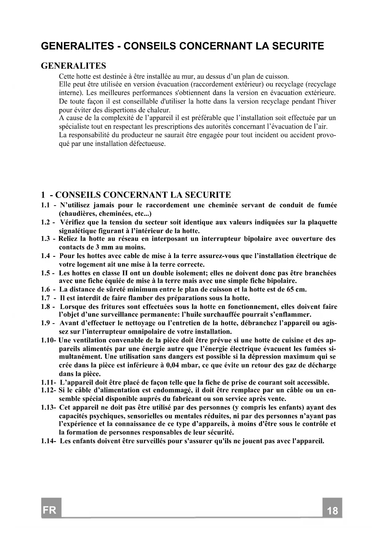 GENERALITES - CONSEILS CONCERNANT LA SECURITE GENERALITES Cette hotte est destinée à être installée au mur, au dessus d’un plan de cuisson.