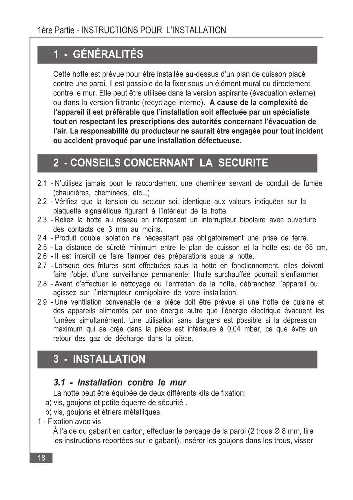 1 - GÉNÉRALITÉS Cette hotte est prévue pour être installée au-dessus d’un plan de cuisson placé