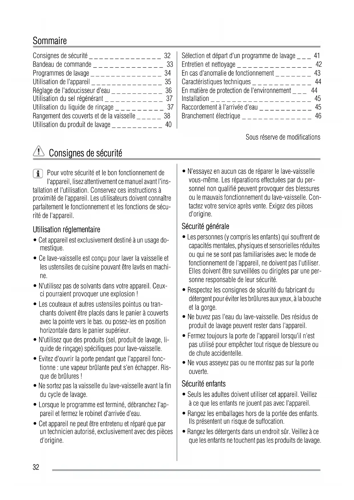 Consignes de sécurité _ _ _ _ _ _ _ _ _ _ _ _ _ _ 32