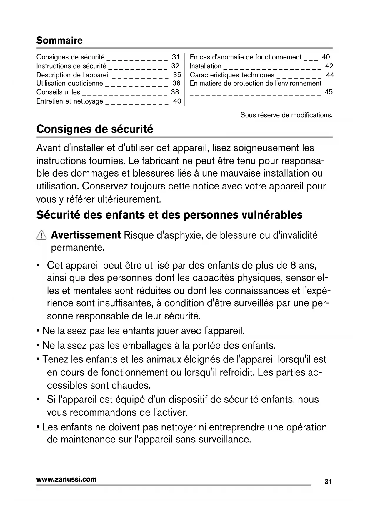 Consignes de sécurité _ _ _ _ _ _ _ _ _ _ _ 31