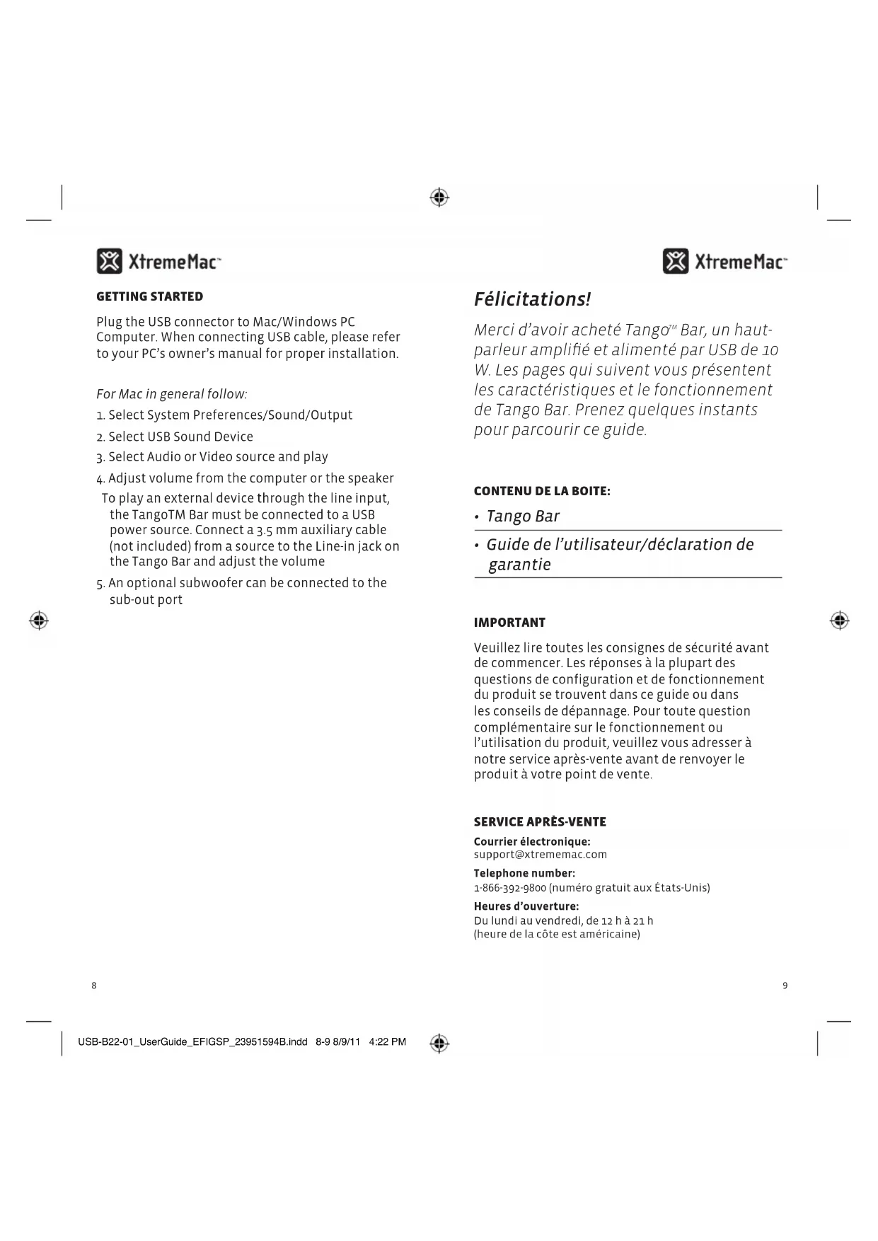 - Guide de l’utilisateur/déclaration de garantie ImPORTAnT Veuillez lire toutes les consignes de sécurité avant de commencer. Les réponses à la plupart des questions de configuration et de fonctionnement du produit se trouvent dans ce guide ou dans les conseils de dépannage. Pour toute question complémentaire sur le fonctionnement ou l’utilisation du produit, veuillez vous adresser à notre service après-vente avant de renvoyer le produit à votre point de vente. SERvICE APRÈS-vEnTE Courrier électronique: support@xtrememac.com Telephone number: 1-866-392-9800 (numéro gratuit aux États-Unis) Heures d’ouverture: Du lundi au vendredi, de 12 h à 21 h (heure de la côte est américaine) USB-B22-01_UserGuide_EFIGSP_23951594B.indd 8-9 8/9/11 4:22 PM10 11