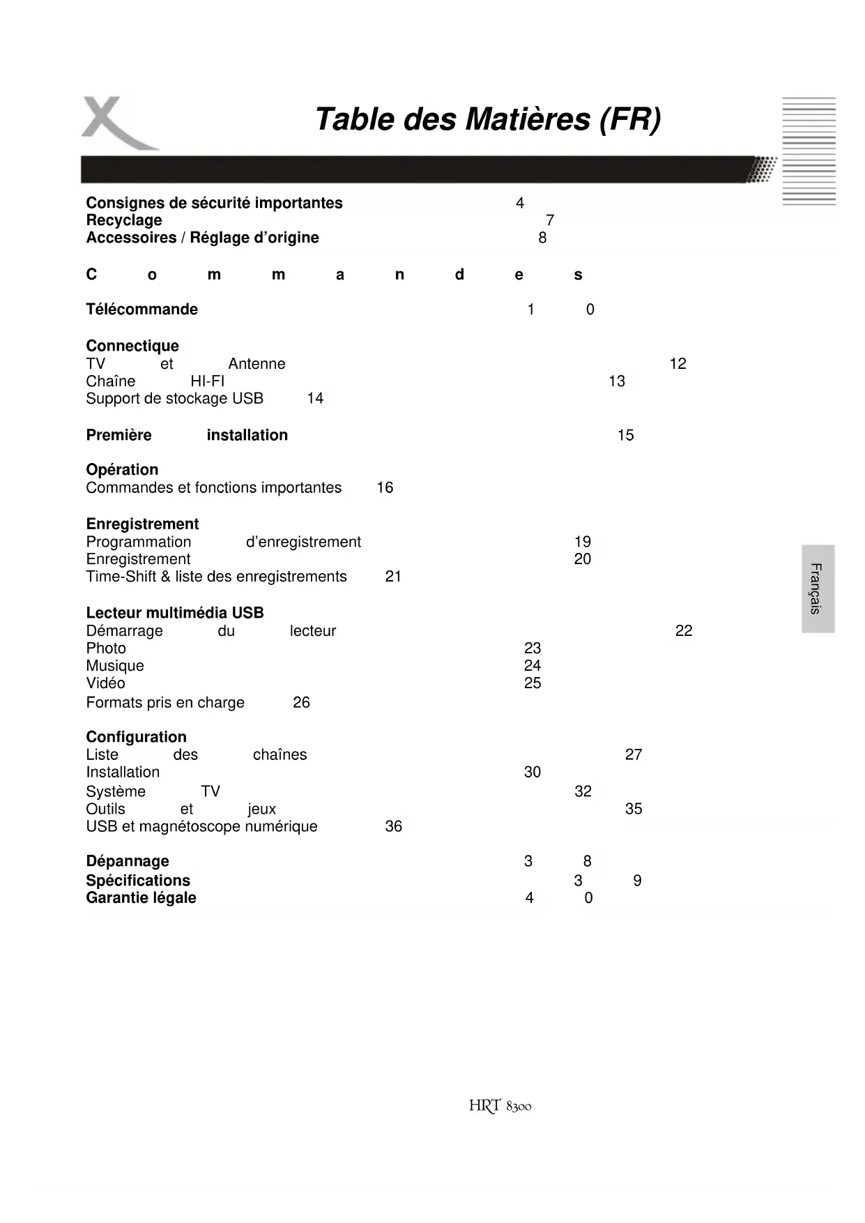 Limited WarrantyMode d’emploi (FR) HRT 8300HRT 8300 3 Français Table des Matières (FR) Consignes de sécurité importantes 4 Recyclage 7 Accessoires / Réglage d’origine 8 Commandes 9 Télécommande 10 Connectique TV et Antenne 12 Chaîne HI-FI 13 Support de stockage USB 14 Première installation 15 Opération Commandes et fonctions importantes 16 Enregistrement Programmation d’enregistrement 19 Enregistrement 20 Time-Shift & liste des enregistrements 21 Lecteur multimédia USB Démarrage du lecteur 22 Photo 23 Musique 24 Vidéo 25 Formats pris en charge 26 Configuration Liste des chaînes 27 Installation 30 Système TV 32 Outils et jeux 35 USB et magnétoscope numérique 36 Dépannage 38 Spécifications 39 Garantie légale 404 HRT 8300 Français Consignes de sécurité importantes Manuel d’utilisation