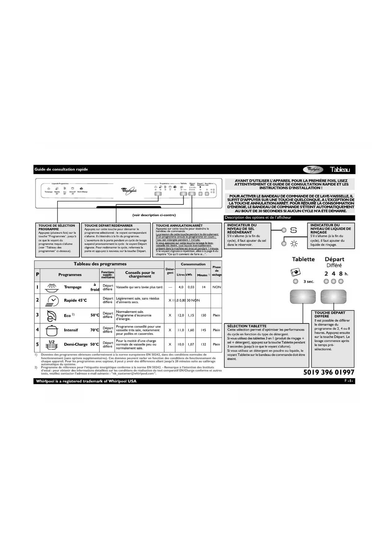 POUR ACTIVER LE BANDEAU DE COMMANDE DE CE LAVE-VAISSELLE, IL SUFFIT D’APPUYER SUR UNE TOUCHE QUELCONQUE, À L’EXCEPTION DE LA TOUCHE ANNULATION/ARRÊT. POUR RÉDUIRE LA CONSOMMATION D’ÉNERGIE, LE BANDEAU DE COMMANDE S’ÉTEINT AUTOMATIQUEMENT AU BOUT DE 30 SECONDES SI AUCUN CYCLE N’A ÉTÉ DÉMARRÉ. SÉLECTION TABLETTECette sélection permet d’optimiser les performances du cycle en fonction du type de détergent.Si vous utilisez des tablettes 3 en 1 (produit de rinçage + sel + détergent), appuyez sur la touche Tablette pendant 3 secondes (jusqu’à ce que le voyant s’allume).Si vous utilisez un détergent en poudre ou liquide, le voyant Tablette sur le bandeau de commande doit être éteint. Guide de consultation rapideF