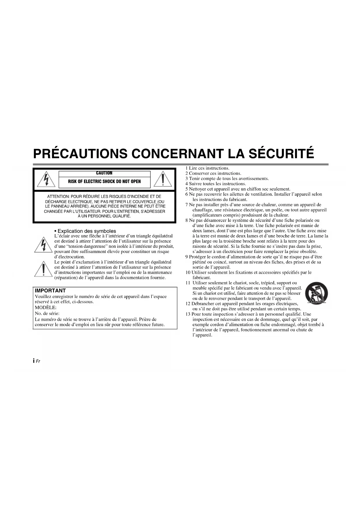 Utiliser seulement le chariot, socle, trépied, support ou meuble spécifié par le fabricant ou vendu avec l’appareil. Si un chariot est utilisé, faire attention de ne pas se blesser ou de le renverser pendant le transport de l’appareil. 12 Débrancher cet appareil pendant les orages électriques, ou s’il ne doit pas être utilisé pendant un certain temps. 13 Pour toute inspection s’adresser à un personnel qualifié. Une inspection est nécessaire en cas de dommage, quel qu’il soit, par exemple cordon d’alimentation ou fiche endommagé, objet tombé à l’intérieur de l’appareil, fonctionnement anormal ou chute de l’appareil. CAUTION RISK OF ELECTRIC SHOCK DO NOT OPEN ATTENTION: POUR RÉDUIRE LES RISQUES D’INCENDIE ET DE DÉCHARGE ELECTRIQUE, NE PAS RETIRER LE COUVERCLE (OU LE PANNEAU ARRIÈRE). AUCUNE PIÈCE INTERNE NE PEUT ÊTRE CHANGÉE PAR L’UTILISATEUR. POUR L’ENTRETIEN, S’ADRESSER À UN PERSONNEL QUALIFIÉ.