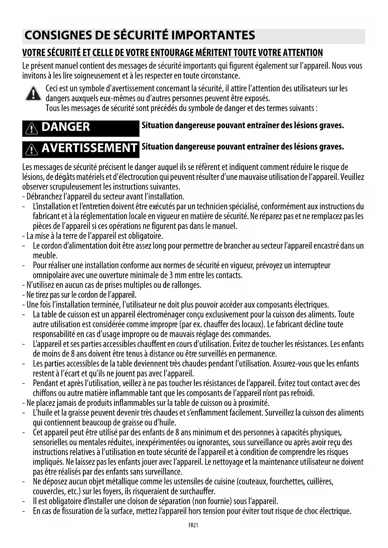 Ideal for keeping just-cooked food warm, for creaming risottos and for keeping serving dishes warm (with induction-suitable accessory) OFF Zero power Support surface Hob in stand-by or off mode (possible end-of-cooking residual heat, indicated by an “H”)FR21 VOTRE SÉCURITÉ ET CELLE DE VOTRE ENTOURAGE MÉRITENT TOUTE VOTRE ATTENTION Le présent manuel contient des messages de sécurité importants qui figurent également sur l’appareil. Nous vous invitons à les lire soigneusement et à les respecter en toute circonstance. Les messages de sécurité précisent le danger auquel ils se réfèrent et indiquent comment réduire le risque de lésions, de dégâts matériels et d’électrocution qui peuvent résulter d’une mauvaise utilisation de l’appareil. Veuillez observer scrupuleusement les instructions suivantes. - Débranchez l’appareil du secteur avant l’installation. - L’installation et l’entretien doivent être exécutés par un technicien spécialisé, conformément aux instructions du fabricant et à la réglementation locale en vigueur en matière de sécurité. Ne réparez pas et ne remplacez pas les pièces de l’appareil si ces opérations ne figurent pas dans le manuel. - La mise à la terre de l’appareil est obligatoire. - Le cordon d’alimentation doit être assez long pour permettre de brancher au secteur l’appareil encastré dans un meuble. - Pour réaliser une installation conforme aux normes de sécurité en vigueur, prévoyez un interrupteur omnipolaire avec une ouverture minimale de 3 mm entre les contacts. - N’utilisez en aucun cas de prises multiples ou de rallonges. - Ne tirez pas sur le cordon de l’appareil. - Une fois l’installation terminée, l’utilisateur ne doit plus pouvoir accéder aux composants électriques. - La table de cuisson est un appareil électroménager conçu exclusivement pour la cuisson des aliments. Toute autre utilisation est considérée comme impropre (par ex. chauffer des locaux). Le fabricant décline toute responsabilité en cas d’usage impropre ou de mauvais réglage des commandes. - L’appareil et ses parties accessibles chauffent en cours d’utilisation. Évitez de toucher les résistances. Les enfants de moins de 8 ans doivent être tenus à distance ou être surveillés en permanence. - Les parties accessibles de la table deviennent très chaudes pendant l’utilisation. Assurez-vous que les enfants restent à l’écart et qu’ils ne jouent pas avec l’appareil. - Pendant et après l’utilisation, veillez à ne pas toucher les résistances de l’appareil. Évitez tout contact avec des chiffons ou autre matière inflammable tant que les composants de l’appareil n’ont pas refroidi. - Ne placez jamais de produits inflammables sur la table de cuisson ou à proximité. - L’huile et la graisse peuvent devenir très chaudes et s’enflamment facilement. Surveillez la cuisson des aliments qui contiennent beaucoup de graisse ou d’huile. - Cet appareil peut être utilisé par des enfants de 8 ans minimum et des personnes à capacités physiques, sensorielles ou mentales réduites, inexpérimentées ou ignorantes, sous surveillance ou après avoir reçu des instructions relatives à l’utilisation en toute sécurité de l’appareil et à condition de comprendre les risques impliqués. Ne laissez pas les enfants jouer avec l’appareil. Le nettoyage et la maintenance utilisateur ne doivent pas être réalisés par des enfants sans surveillance. - Ne déposez aucun objet métallique comme les ustensiles de cuisine (couteaux, fourchettes, cuillères, couvercles, etc.) sur les foyers, ils risqueraient de surchauffer. - Il est obligatoire d’installer une cloison de séparation (non fournie) sous l’appareil. - En cas de fissuration de la surface, mettez l’appareil hors tension pour éviter tout risque de choc électrique.