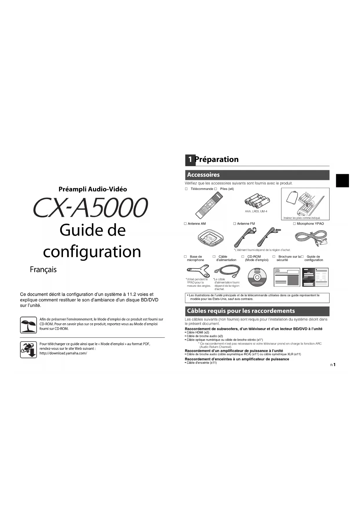 - Les illustrations de l’unité principale et de la télécommande utilisées dans ce guide représentent le modèle pour les États-Unis, sauf avis contraire. Câbles requis pour les raccordements UAB Ce document décrit la configuration d’un système à 11.2 voies et explique comment restituer le son d’ambiance d’un disque BD/DVD sur l’unité. Afin de préserver l’environnement, le Mode d’emploi de ce produit est fourni sur CD-ROM. Pour en savoir plus sur ce produit, reportez-vous au Mode d’emploi fourni sur CD-ROM.Pour télécharger ce guide ainsi que le « Mode d’emploi » au format PDF, rendez-vous sur le site Web suivant :http://download.yamaha.com/ Guide de configuration Français Préampli Audio-Vidéo CX-A5000_sg_CTKGLVF.fm Page 1 Tuesday, May 14, 2013 10:23 AM2 Fr Raccordez un amplificateur de puissance et des subwoofers (avec amplificateur intégré) à l’unité, puis les enceintes à l’amplificateur de puissance.
