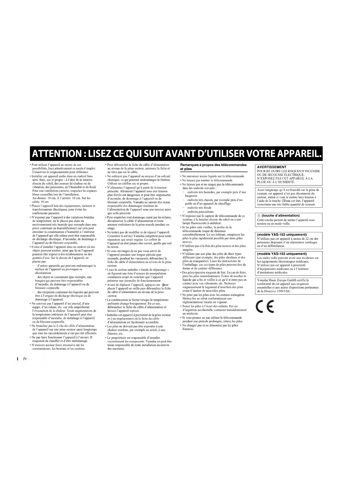 - Yamaha ne garantit pas toutes les connexions sans fil entre cette barre de son et les appareils compatibles Bluetooth. La description suivante s’applique uniquement au modèle YAS-103. Informations à destination des utilisateurs concernant la collecte et la mise au rebut des piles et équipement usagés Les symboles sur les produits, l’emballage et/ou les documents joints signifient que les produits électriques ou électroniques usagés ainsi que les piles ne doivent pas être mélangés avec les déchets domestiques habituels. Pour un traitement, une récupération et un recyclage appropriés des déchets d’équipements électriques et électroniques et des piles usagées, veuillez les déposer aux points de collecte prévus à cet effet, conformément à la réglementation nationale et aux Directives 2002/96/EC et 2006/66/ EC. En vous débarrassant correctement des déchets d’équipements électriques et électroniques et des piles usagées, vous contribuerez à la sauvegarde de précieuses ressources et à la prévention de potentiels effets négatifs sur la santé humaine qui pourraient advenir lors d’un traitement inapproprié des déchets. Pour plus d’informations à propos de la collecte et du recyclage des déchets d’équipements électriques et électroniques et des piles usagées, veuillez contacter votre municipalité, votre service de traitement des déchets ou le point de vente où vous avez acheté les produits. [Information sur le traitement dans d’autres pays en dehors de l’Union Européenne] Ces symboles sont seulement valables dans l’Union Européenne. Si vous souhaitez vous débarrasser de déchets d’équipements électriques et électroniques ou de piles usagées, veuillez contacter les autorités locales ou votre fournisseur et demander la méthode de traitement appropriée. Note pour le symbole « pile » (les deux symboles du bas) : Ce symbole peut être utilisé en combinaison avec un symbole chimique. Dans ce cas il respecte les exigences établies par la Directive pour le produit chimique en question.i
