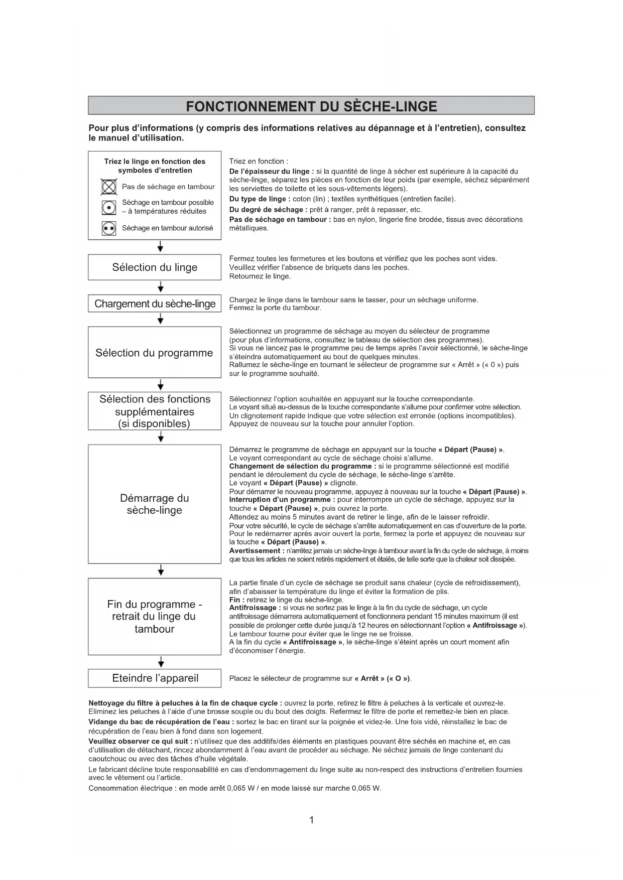 FONCTIONNEMENT DU SÈCHE-LINGE Pour plus d’informations (y compris des informations relatives au dépannage et à l’entretien), consultez