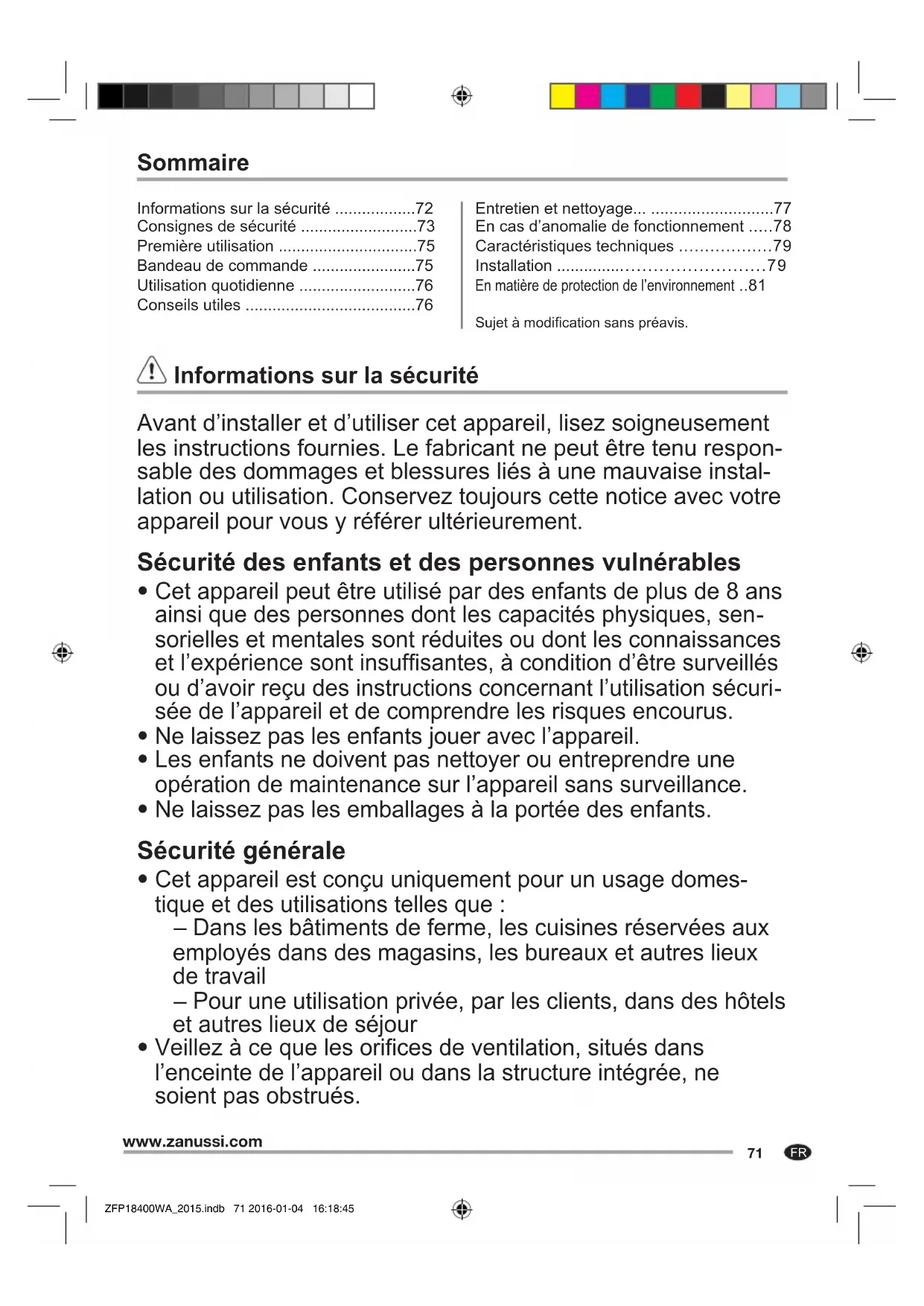 - Veillez à ce que les orices de ventilation, situés dans l’enceinte de l’appareil ou dans la structure intégrée, ne soient pas obstrués. Informations sur la sécurité ..................72 Consignes de sécurité ..........................73 Première utilisation ...............................75 Bandeau de commande .......................75 Utilisation quotidienne ..........................76 Conseils utiles ......................................76 Entretien et nettoyage... ...........................77 En cas d’anomalie de fonctionnement .....78 Caractéristiques techniques ..................79 Installation ........................................79 En matière de protection de l’environnement ..81 Sujet à modication sans préavis. Sommaire Informations sur la sécurité ZFP18400WA_2015.indb 71 2016-01-04 16:18:4572