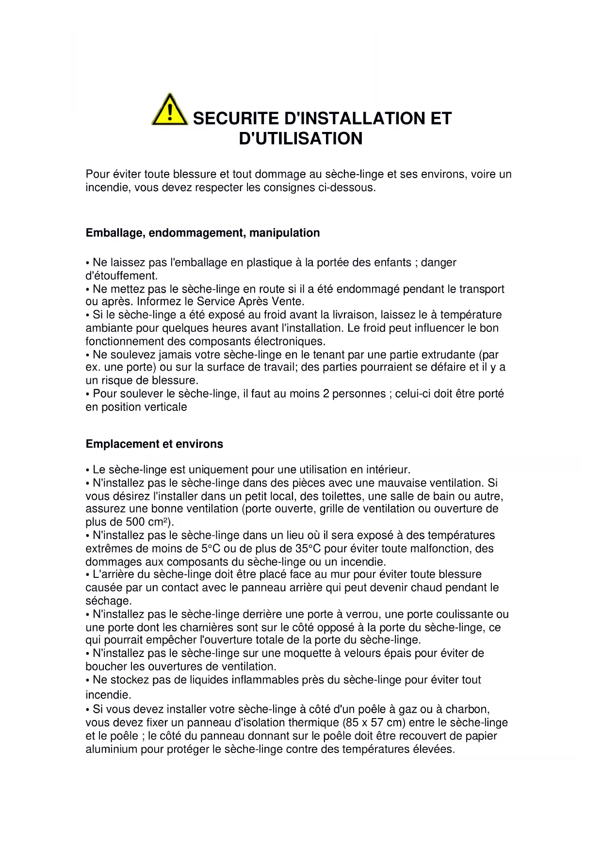 SECURITE D'INSTALLATION ET D'UTILISATION Pour éviter toute blessure et tout dommage au sèche-linge et ses environs, voire un