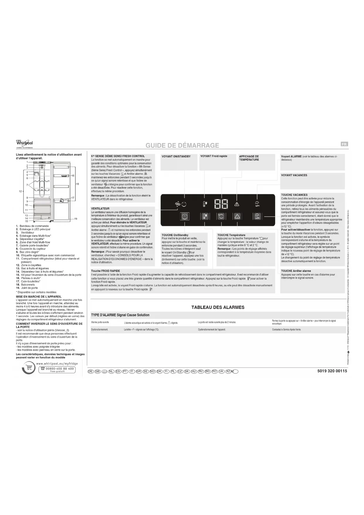 th SENSE (6ÈME SENS) FRESH CONTROLLa fonction se met automatiquement en marche pour garantir des conditions optimales pour la conservation des aliments. Pour désactiver la fonction « 6th Sense (6ème Sens) Fresh Control », appuyez simultanément sur les touches Vacances et Arrêter alarme et maintenez-les enfoncées pendant 3 secondes jusqu'à ce qu'un signal sonore retentisse et que l'icône de ventilateur s'éteigne pour confirmer que la fonction a été désactivée. Pour réactiver cette fonction, effectuez la même procédure. Remarque : La désactivation de la fonction éteint le VENTILATEUR dans le réfrigérateur. VOYANT Froid rapideTOUCHE VACANCESCette fonction peut être activée pour réduire la consommation d'énergie de l'appareil pendant une période prolongée. Avant l'activation de la fonction, retirez tous les aliments périssables du compartiment réfrigérateur et assurez-vous que la porte est fermée correctement, étant donné que le réfrigérateur maintiendra une température appropriée pour empêcher l'apparition d'odeurs désagréables (+12 °C). Pour activer/désactiver la fonction, appuyez sur la touche du mode Vacances pendant 3 secondes. Lorsque la fonction est activée, le symbole correspondant s'allume et la température du compartiment réfrigérateur sera réglée sur un point de réglage supérieur (l'affichage de température indique le nouveau point de réglage de température de +12 °C). Le changement du point de réglage de température désactive automatiquement la fonction.VOYANT VACANCESVENTILATEUR Le ventilateur assure une diffusion homogène de la température à l'intérieur du produit, garantissant ainsi une meilleure conservation des aliments. Le ventilateur est activé par défaut. Pour éteindre le VENTILATEUR appuyez simultanément sur les touches Vacances et Arrêter alarme et maintenez-les enfoncées pendant 3 secondes jusqu'à ce qu'un signal sonore retentisse et que l'icône de ventilateur s'éteigne pour confirmer que le ventilateur a été désactivé. Pour activer le VENTILATEUR, effectuez la même procédure. Un signal sonore retentit et l'icône s'allume en guise de confirmation.Remarque : Pour savoir pourquoi désactiver le ventilateur, cherchez « CONSEILS POUR LA REALISATION D'ECONOMIES D'ENERGIE » dans la notice d'utilisation.VOYANT ON/STANDBYVoyant ALARME (voir le tableau des alarmes ci-dessous)AFFICHAGE DE TEMPÉRATURETOUCHE On/StandbyPour mettre le produit en veille, appuyez sur la touche et maintenez-la enfoncée pendant 3 secondes. Toutes les icônes s'éteignent sauf le voyant On/Standby . Pour réactiver l'appareil, appuyez une fois (brièvement) sur cette touche. (voir la notice d'utilisation).TOUCHE TempératureAppuyez sur la touche Température pour changer la température : la valeur change de manière cyclique entre 8 °C et 2 °C.Remarque : Les points de réglage affichés correspondent à la température moyenne dans tout le réfrigérateur.