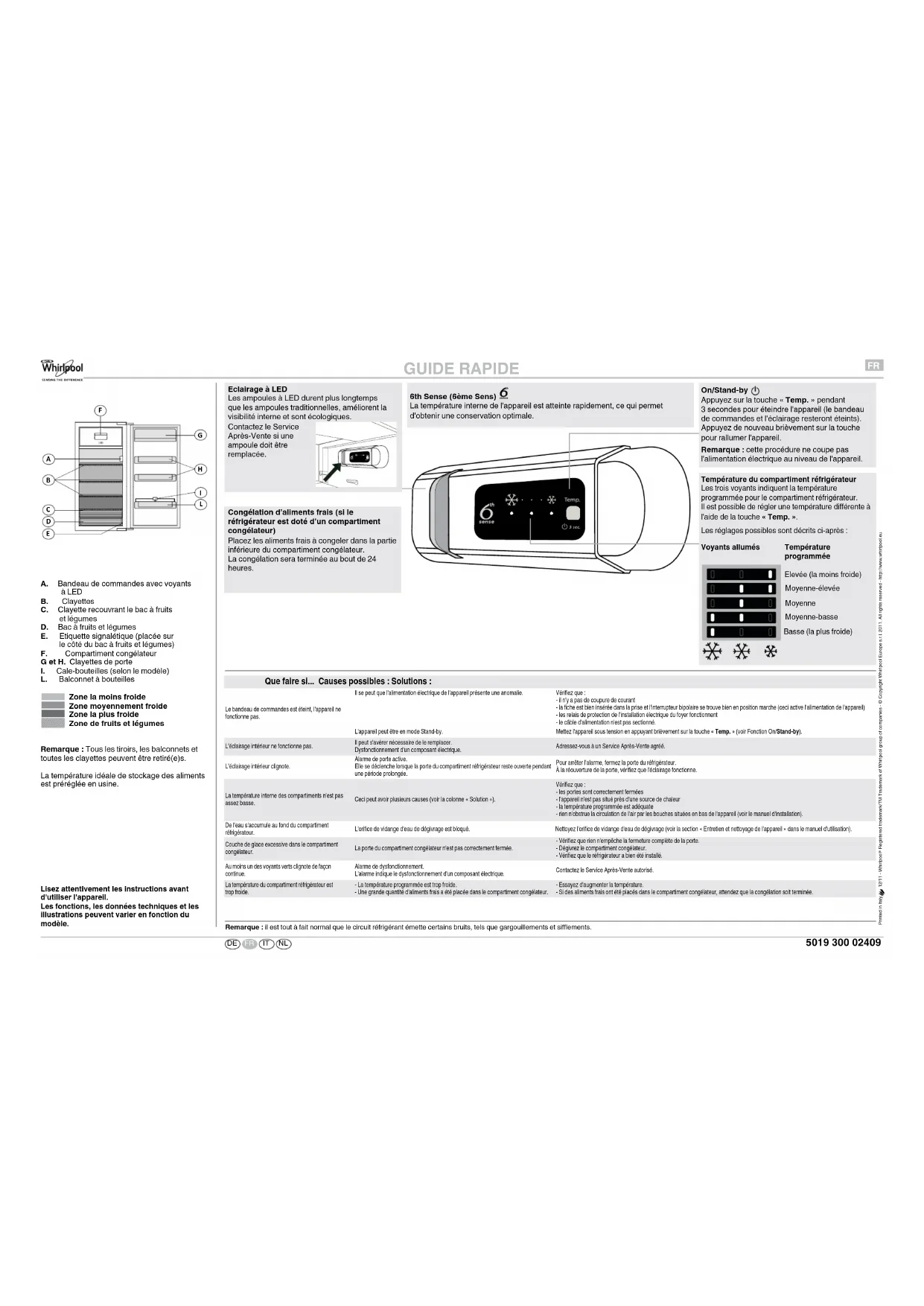 GUIDE RAPIDE A. Bandeau de commandes avec voyants à LEDB. ClayettesC. Clayette recouvrant le bac à fruits et légumesD. Bac à fruits et légumesE. Etiquette signalétique (placée sur le côté du bac à fruits et légumes)F. Compartiment congélateurG et H. Clayettes de porteI. Cale-bouteilles (selon le modèle)L. Balconnet à bouteilles Zone la moins froideZone moyennement froideZone la plus froideZone de fruits et légumes Remarque : Tous les tiroirs, les balconnets et toutes les clayettes peuvent être retiré(e)s. La température idéale de stockage des aliments est préréglée en usine. Que faire si... Causes possibles : Solutions : Le bandeau de commandes est éteint, l'appareil ne fonctionne pas.Il se peut que l'alimentation électrique de l'appareil présente une anomalie.L'appareil peut être en mode Stand-by.Vérifiez que :- il n'y a pas de coupure de courant - la fiche est bien insérée dans la prise et l'interrupteur bipolaire se trouve bien en position marche (ceci active l'alimentation de l'appareil) - les relais de protection de l'installation électrique du foyer fonctionnent- le câble d'alimentation n'est pas sectionné. Mettez l'appareil sous tension en appuyant brièvement sur la touche « Temp. » (voir Fonction On/Stand-by). L'éclairage intérieur ne fonctionne pas.Il peut s'avérer nécessaire de le remplacer.Dysfonctionnement d'un composant électrique.Adressez-vous à un Service Après-Vente agréé.L'éclairage intérieur clignote.Alarme de porte active.Elle se déclenche lorsque la porte du compartiment réfrigérateur reste ouverte pendant une période prolongée. Pour arrêter l'alarme, fermez la porte du réfrigérateur.À la réouverture de la porte, vérifiez que l'éclairage fonctionne.La température interne des compartiments n'est pas assez basse.Ceci peut avoir plusieurs causes (voir la colonne « Solution »).Vérifiez que :- les portes sont correctement fermées- l'appareil n'est pas situé près d'une source de chaleur- la température programmée est adéquate - rien n'obstrue la circulation de l'air par les bouches situées en bas de l'appareil (voir le manuel d'installation). De l'eau s'accumule au fond du compartiment réfrigérateur. L'orifice de vidange d'eau de dégivrage est bloqué. Nettoyez l'orifice de vidange d'eau de dégivrage (voir la section « Entretien et nettoyage de l'appareil » dans le manuel d'utilisation). Couche de glace excessive dans le compartiment congélateur.La porte du compartiment congélateur n'est pas correctement fermée.- Vérifiez que rien n'empêche la fermeture complète de la porte.- Dégivrez le compartiment congélateur.- Vérifiez que le réfrigérateur a bien été installé.Au moins un des voyants verts clignote de façon continue.Alarme de dysfonctionnement.L'alarme indique le dysfonctionnement d'un composant électrique.Contactez le Service Après-Vente autorisé. La température du compartiment réfrigérateur est trop froide.- La température programmée est trop froide.- Une grande quantité d'aliments frais a été placée dans le compartiment congélateur.- Essayez d'augmenter la température.- Si des aliments frais ont été placés dans le compartiment congélateur, attendez que la congélation soit terminée.