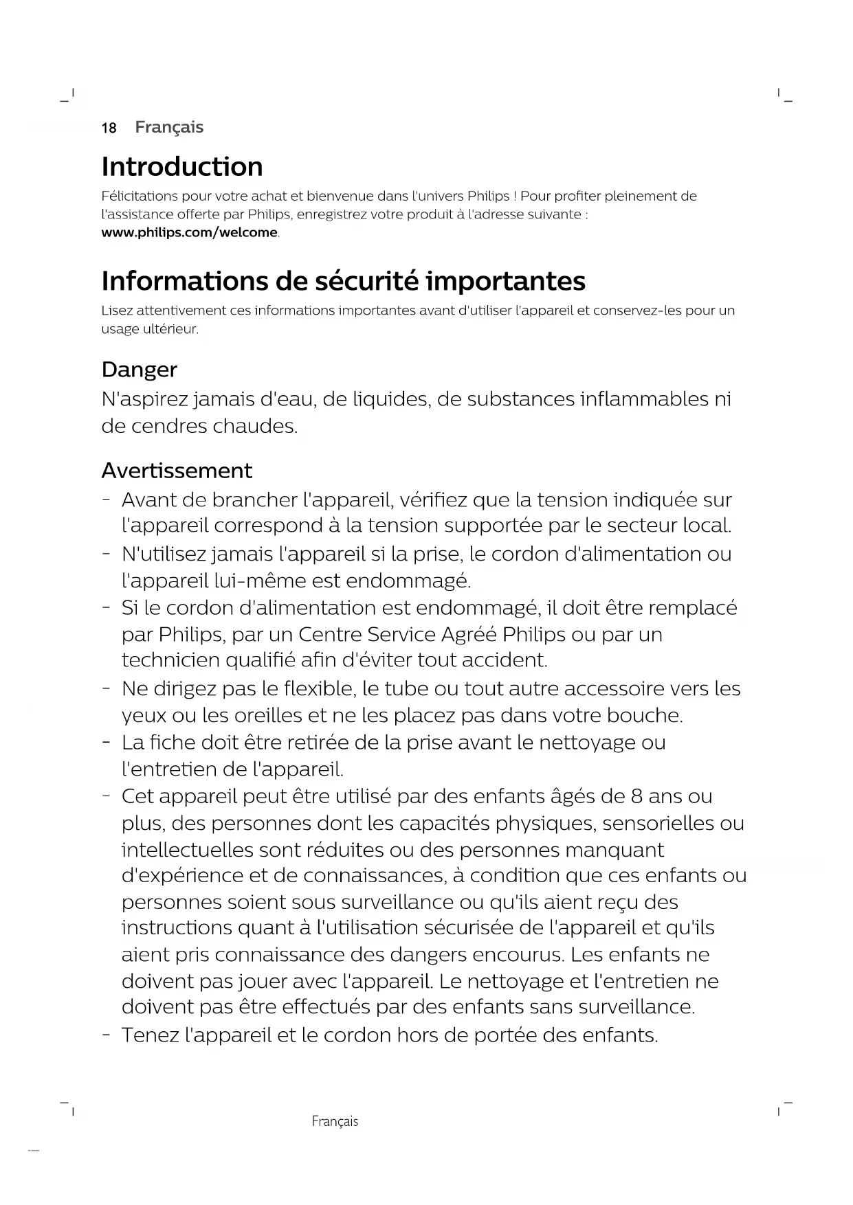 Félicitations pour votre achat et bienvenue dans l'univers Philips! Pour profiter pleinement de l'assistance offerte par Philips, enregistrez votre produit à l'adresse suivante:www.philips.com/welcome. Informations de sécurité importantes Lisez attentivement ces informations importantes avant d'utiliser l'appareil et conservez-les pour unusage ultérieur. Danger