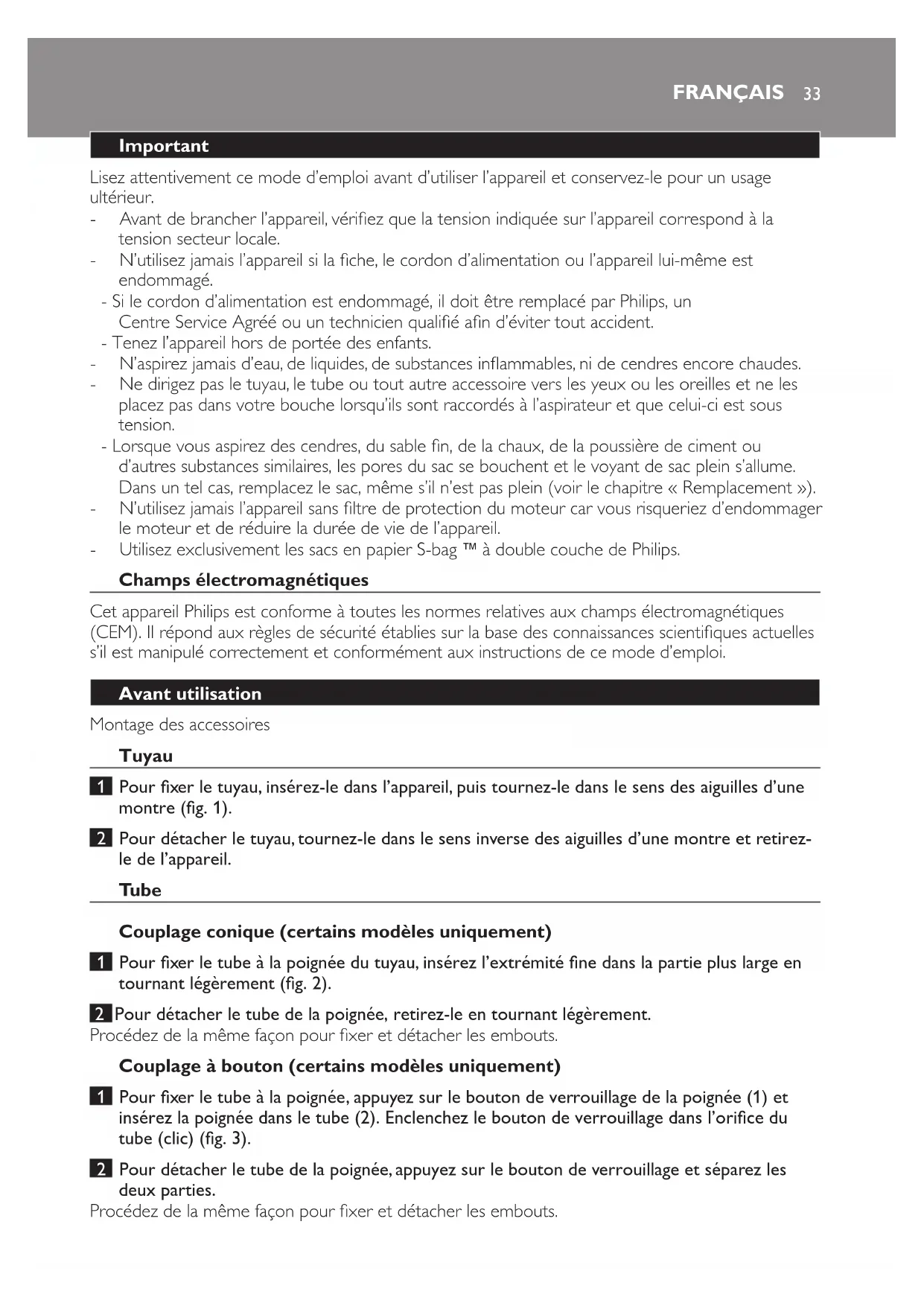 - Utilisez exclusivement les sacs en papier S-bag ` à double couche de Philips.