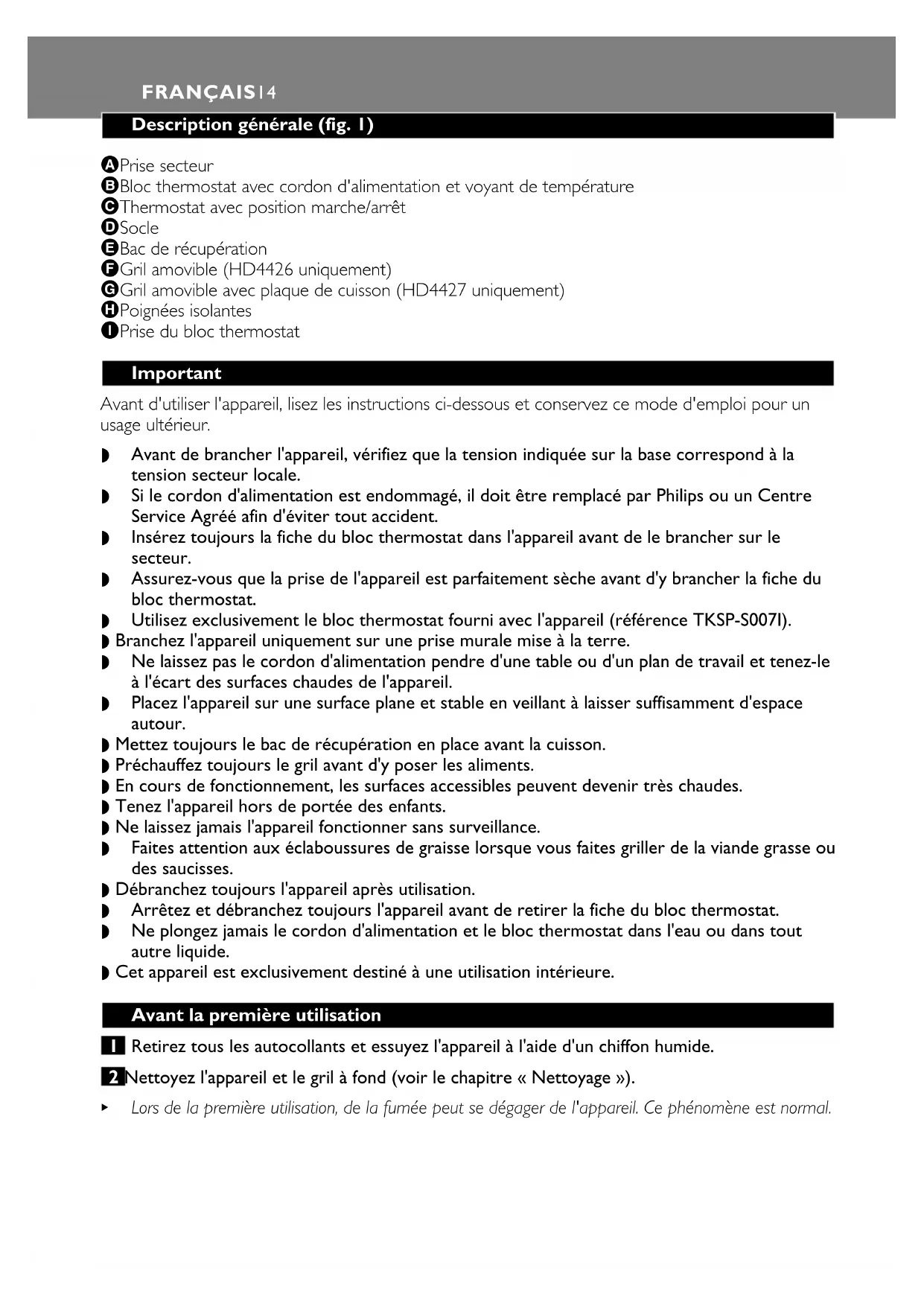 B Lors de la première utilisation, de la fumée peut se dégager de l'appareil. Ce phénomène est normal.