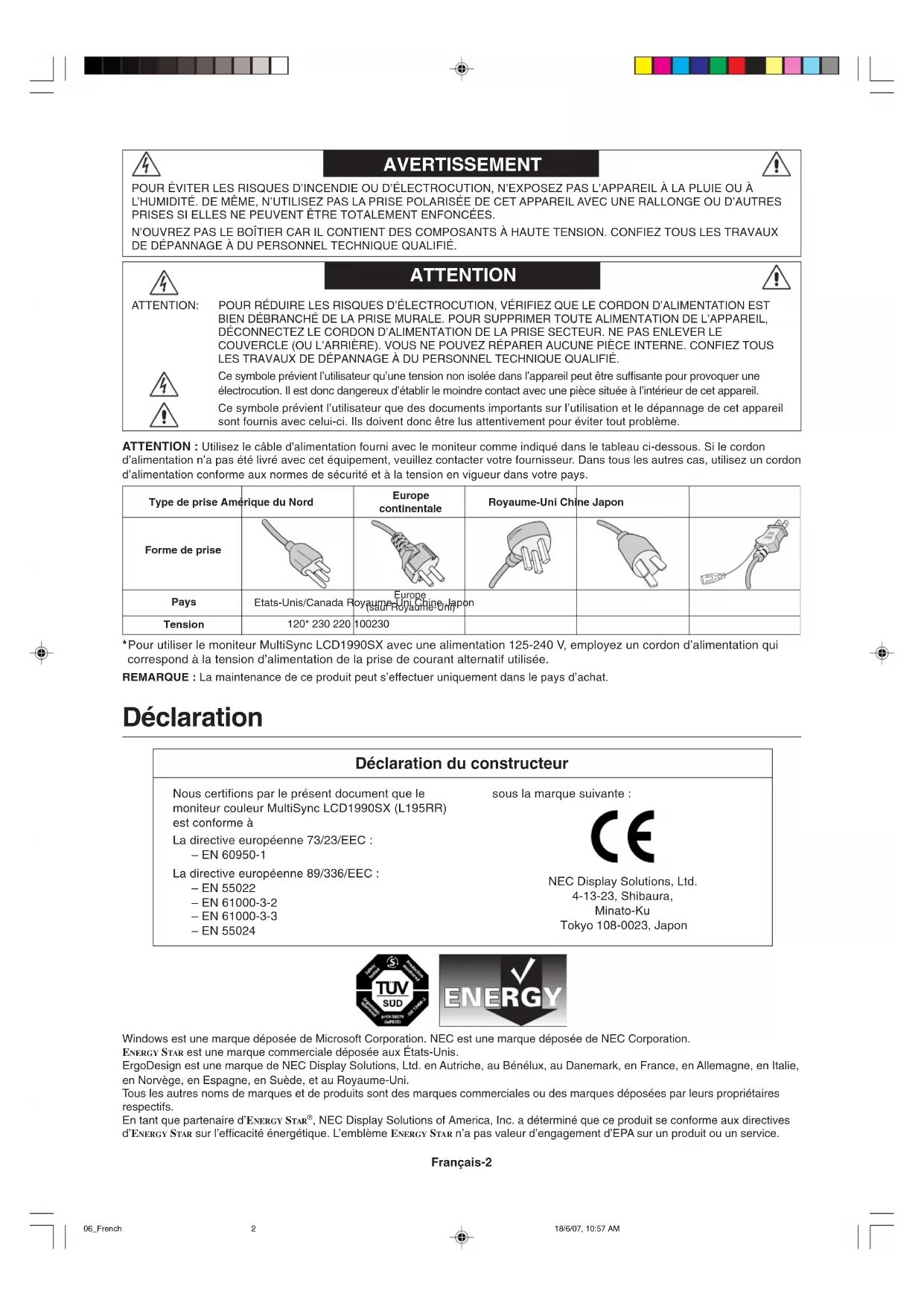 , NEC Display Solutions of America, Inc. a déterminé que ce produit se conforme aux directives d’ENERGY STAR sur l’efficacité énergétique. L’emblème ENERGY STA R n’a pas valeur d’engagement d’EPA sur un produit ou un service. 06_French 18/6/07, 10:57 AM2Français Français-3 Contenu La boîte* de votre nouveau moniteur NEC doit contenir les éléments suivants :