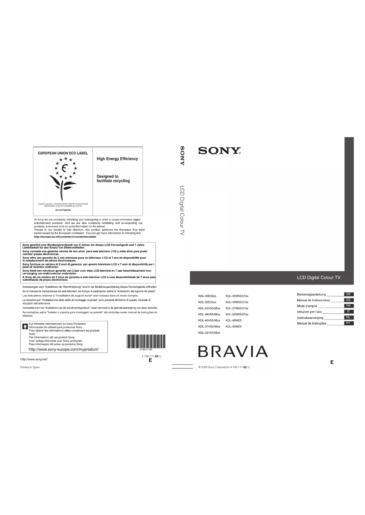 Retrouvez gratuitement la notice de l'appareil Bravia KDL32W5500K SONY au format PDF.