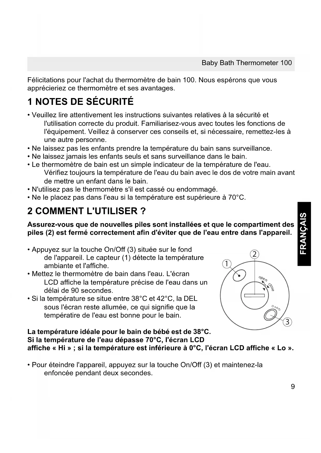 FRANÇAIS Félicitations pour l'achat du thermomètre de bain 100. Nous espérons que vous apprécieriez ce thermomètre et ses avantages.