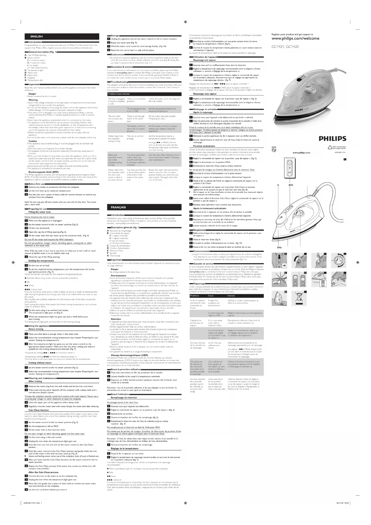 4 Store the iron on its heel in a safe and dry place. Environment - Do not throw away the appliance with the normal household waste at the end of its life, but hand it in at an ofcial collection point for recycling. By doing this, you help to preserve the environment (Fig. 11).Guarantee & serviceIf you need service or information or if you have a problem, please visit the Philips website at www.philips.com or contact the Philips Consumer Care Centre in your country (you nd its phone number in the worldwide guarantee leaet). If there is no Consumer Care Centre in your country, go to your local Philips dealer.TroubleshootingThis chapter summarises the most common problems you could encounter with your iron. If you are unable to solve the problem, contact the Consumer Care Centre in your country. Problem Cause SolutionThe iron is plugged in but the soleplate is cold.There is a connection problem.Check the mains cord, the plug and the wall socket.The temperature dial is set to MIN.Set the temperature dial to the required temperature.The iron does not produce any steam.There is not enough water in the water tank.Fill the water tank (see chapter ‘Preparing for use’).The steam control is set to the ‘no steam’ position.Set the steam control to a steam setting (see chapter ‘Using the appliance’).Water leaks from the soleplate during ironing.The iron is not hot enough.Set the temperature dial to a temperature suitable for steam ironing ( 2 to MAX). Put the iron on its heel and wait until the temperature light goes out before you start ironing.Flakes and impurities come out of the soleplate during ironing.You have used hard water, which has caused scale akes to develop inside the soleplate.Use the Calc-Clean function one or more times (see chapter ‘Cleaning and maintenance’).Water leaks from the soleplate while the iron cools down or after it has been stored.You have put the iron in horizontal position while there is still water in the water tank.Empty the water tank and set the steam control to the ‘no steam’ position before you store the iron (see chapter ‘Storage’). Store the iron on its heel. FRANÇAIS IntroductionFélicitations pour votre achat et bienvenue dans l’univers Philips ! Pour proter pleinement de l’assistance Philips, enregistrez votre produit sur le site à l’adresse suivante : www.philips.com/welcome.Description générale (fig. 1)A Bouchon de remplissageB Commande de vapeur - 1 = vapeur minimale - 2 = vapeur maximale - t= pas de vapeur - u= fonction anticalcaire C Voyant de températureD Cordon d’alimentationE Réservoir d’eauF SemelleG ThermostatImportantLisez attentivement ce mode d’emploi avant d’utiliser l’appareil et conservez-le pour un usage ultérieur.Danger - Ne plongez jamais le fer dans l’eau.Avertissement - Avant de brancher l’appareil, vériez que la tension indiquée sur la plaque signalétique correspond à la tension secteur locale. - N’utilisez pas le fer à repasser si la che, le cordon d’alimentation ou l’appareil lui-même est endommagé, ou si le fer est tombé et/ou si de l’eau s’écoule de l’appareil. - Si le cordon d’alimentation est endommagé, il doit être remplacé par Philips, un Centre Service Agréé Philips ou un technicien qualié an d’éviter tout accident. - Ne laissez jamais l’appareil sans surveillance pendant qu’il est branché. - Cet appareil n’est pas destiné à être utilisé par des personnes (notamment des enfants) dont les capacités physiques, sensorielles ou intellectuelles sont réduites, ou par des personnes manquant d’expérience ou de connaissances, à moins que celles-ci ne soient sous surveillance ou qu’elles n’aient reçu des instructions quant à l’utilisation de l’appareil par une personne responsable de leur sécurité. - Veillez à ce que les enfants ne puissent pas jouer avec l’appareil. - Évitez tout contact entre le cordon d’alimentation et la semelle du fer à repasser lorsqu’elle est chaude. Attention - Si l’appareil est doté d’une che avec mise à la terre, il doit être connecté à une prise murale avec mise à la terre. - Vériez régulièrement l’état du cordon d’alimentation. - La semelle du fer à repasser peut devenir très chaude et peut par conséquent provoquer des brûlures si vous la touchez. - Lorsque vous avez ni de repasser, lors du nettoyage de l’appareil ou lorsque vous remplissez ou videz le réservoir d’eau, et même si vous laissez le fer sans surveillance pendant un bref instant, réglez la commande de vapeur sur la position « pas de vapeur ». Placez le fer à repasser sur le talon et débranchez l’appareil. - Placez et utilisez toujours le fer à repasser sur une surface stable, plane et horizontale. - Cet appareil est destiné à un usage domestique uniquement.Champs électromagnétiques (CEM)Cet appareil Philips est conforme à toutes les normes relatives aux champs électromagnétiques (CEM). Il répond aux règles de sécurité établies sur la base des connaissances scientiques actuelles s’il est manipulé correctement et conformément aux instructions de ce mode d’emploi.Avant la première utilisation 1 Ôteztoutautocollantoulmdeprotectiondelasemelle.