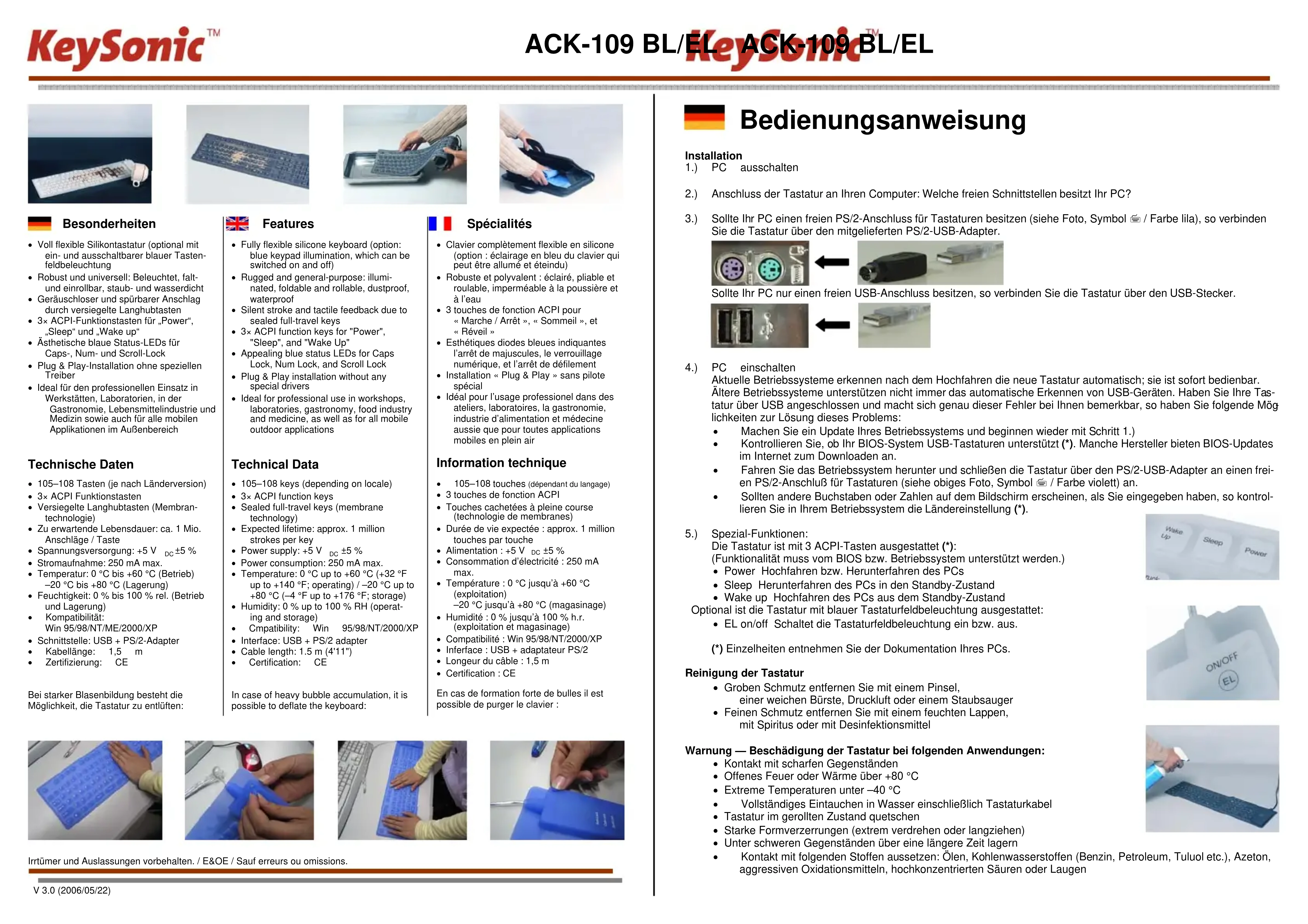 - 3 touches de fonction ACPI • Touches cachetées à pleine course (technologie de membranes) • Durée de vie expectée : approx. 1 million touches par touche • Alimentation : +5 V ±5 % • Consommation d’électricité : 250 mA max. • Température : 0 °C jusqu’à +60 °C (exploitation) –20 °C jusqu’à +80 °C (magasinage) • Humidité : 0 % jusqu’à 100 % h.r. (exploitation et magasinage) • Compatibilité : Win 95/98/NT/2000/XP • Inferface : USB + adaptateur PS/2 • Longeur du câble : 1,5 m • Certification : CE En cas de formation forte de bulles il est possible de purger le clavier :