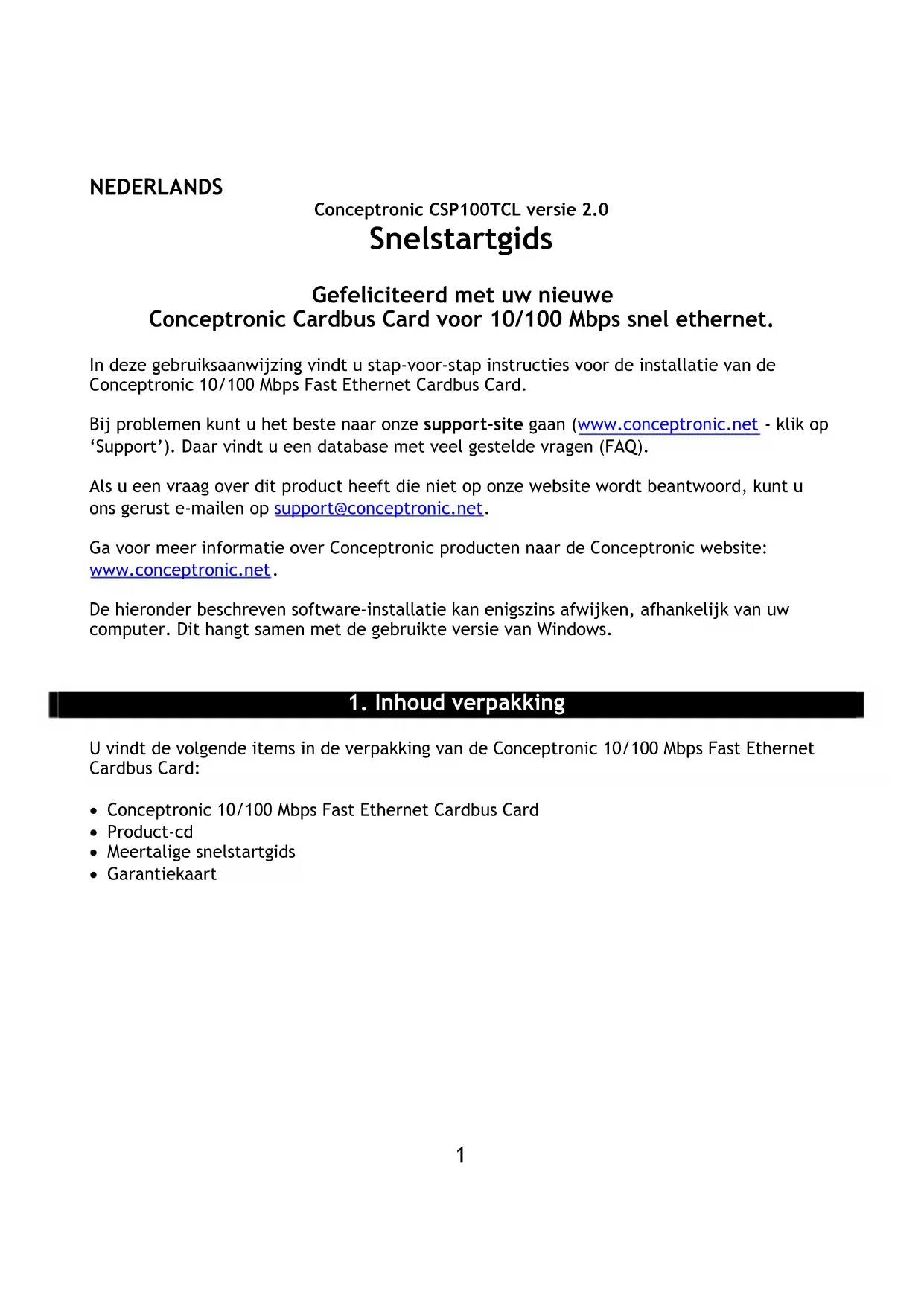 CSP100TCL - Carte réseau / adaptateur CONCEPTRONIC - Notice d'utilisation et mode d'emploi gratuit