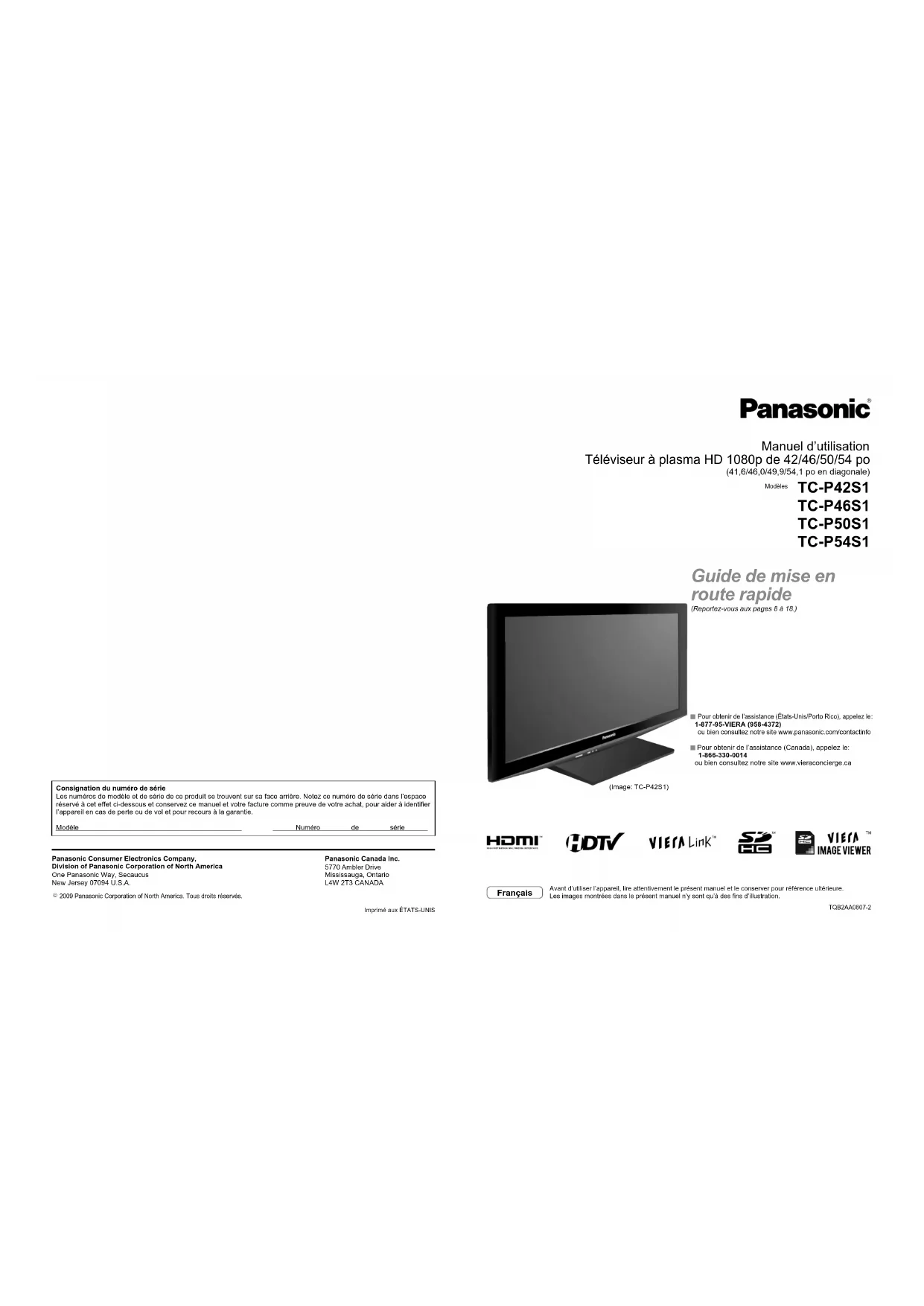 2009 Panasonic Corporation of North America. Tous droits réservés.Imprimé aux ÉTATS-UNIS Pour obtenir de l’assistance (États-Unis/Porto Rico), appelez le : 1-877-95-VIERA (958-4372)