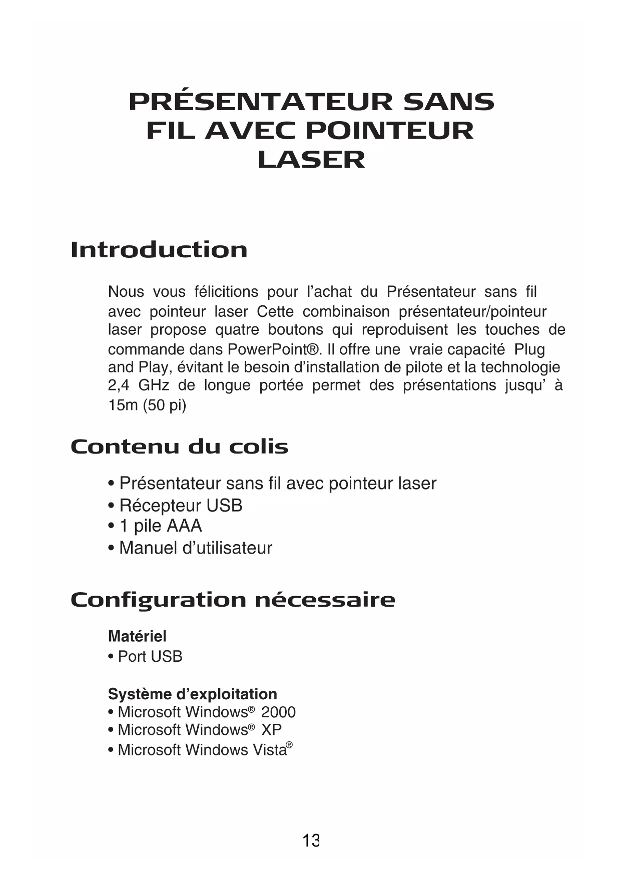 LASER Introduction Nous vous félicitions pour l’achat du Présentateur sans fil avec pointeur laser Cette combinaison présentateur/pointeur laser propose quatre boutons qui reproduisent les touches de commande dans PowerPoint®. Il offre une vraie capacité Plug and Play, évitant le besoin d’installation de pilote et la technologie 2,4 GHz de longue portée permet des présentations jusqu’ à 15m (50 pi) Conguration nécessaire Matériel
