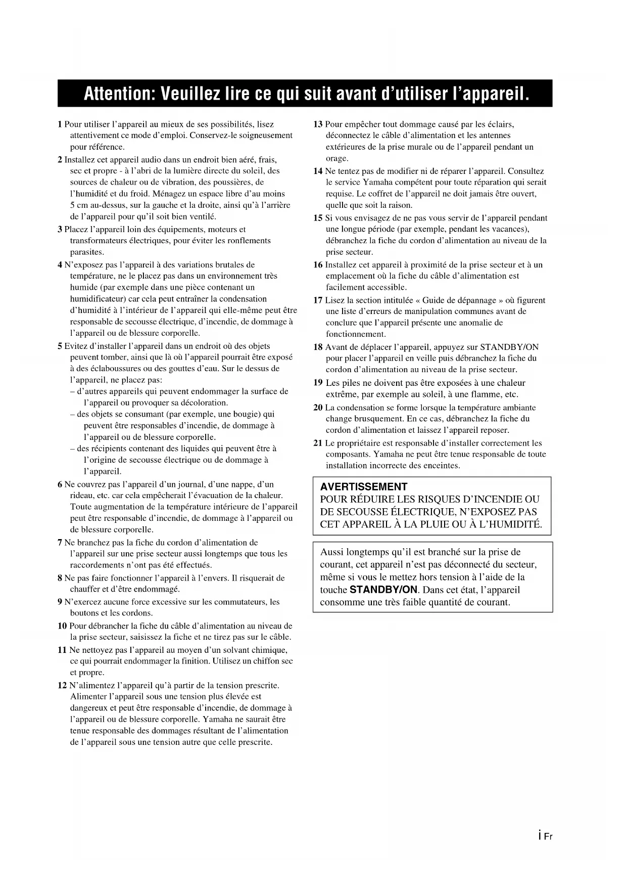 Les piles ne doivent pas être exposées à une chaleur extrême, par exemple au soleil, à une flamme, etc. 20 La condensation se forme lorsque la température ambiante change brusquement. En ce cas, débranchez la fiche du cordon d’alimentation et laissez l’appareil reposer. 21 Le propriétaire est responsable d’installer correctement les composants. Yamaha ne peut être tenue responsable de toute installation incorrecte des enceintes. Attention: Veuillez lire ce qui suit avant d’utiliser l’appareil. AVERTISSEMENT POUR RÉDUIRE LES RISQUES D’INCENDIE OU