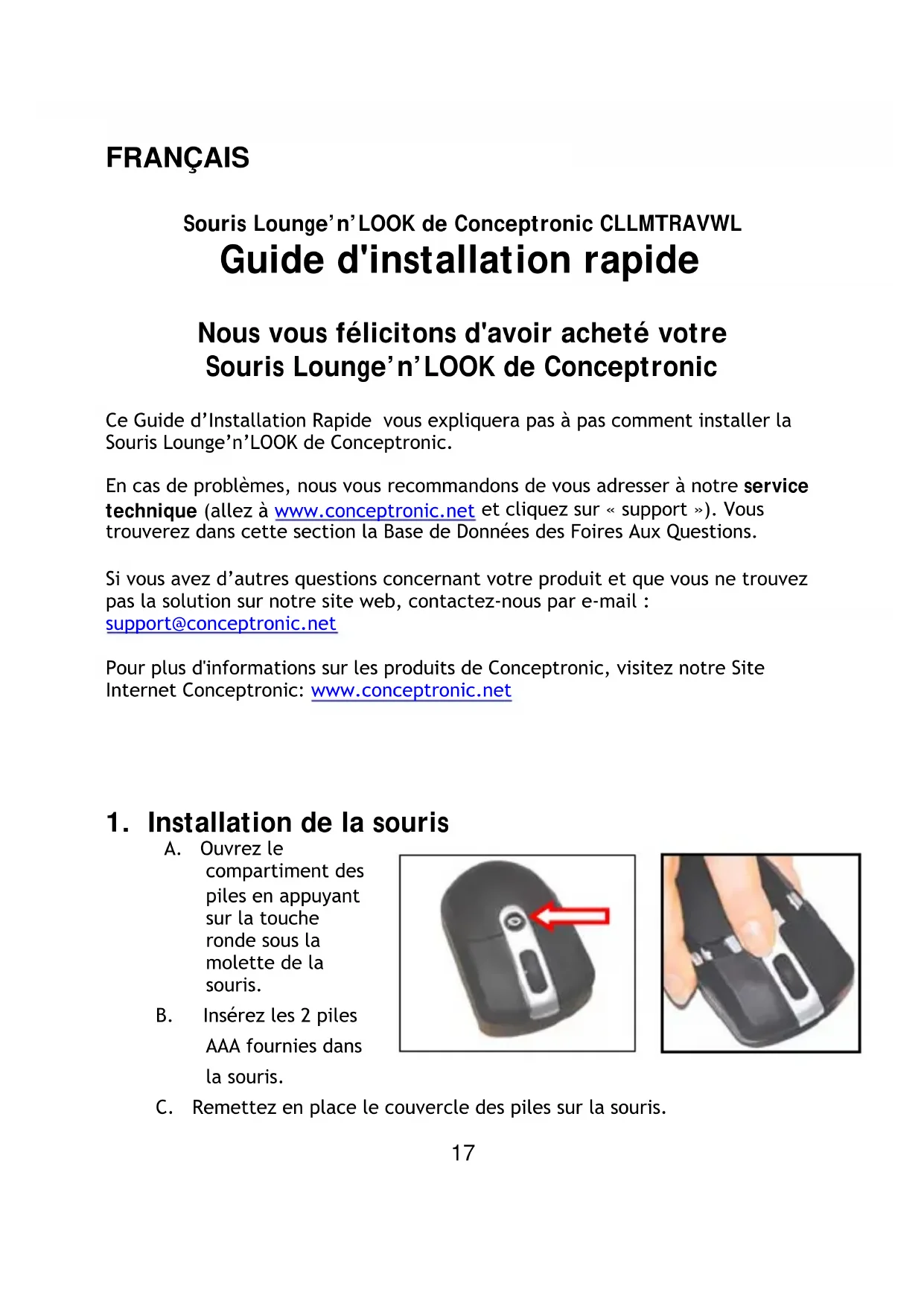 Ce Guide d'Installation Rapide vous expliquera pas à pas comment installer la Souris Lounge'n'LOOK de Conceptronic.