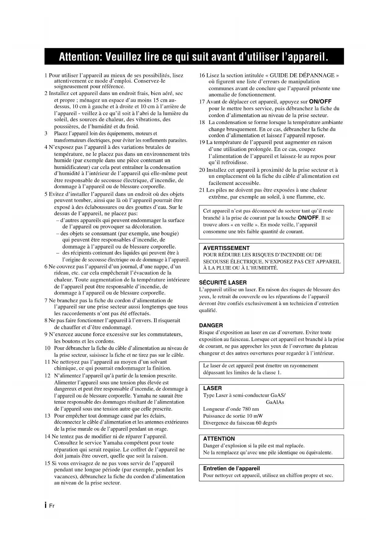 L'appareil utilise un laser. En raison des risques de blessure des yeux, le retrait du couvrole ou les réparations de l'appareil devront être confiés exclusivement à un technicien d'entretien qualificé.