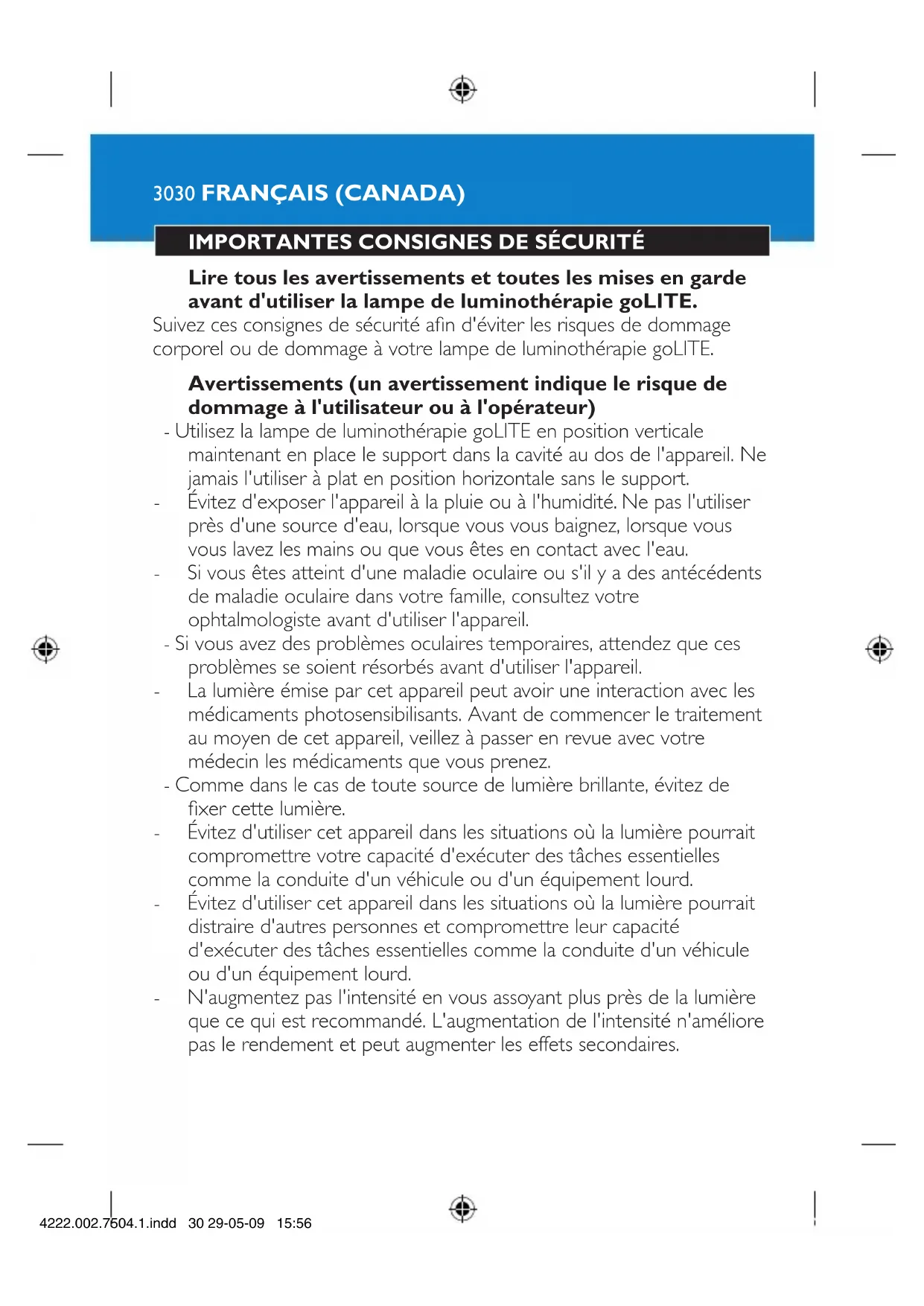 - L'utilisateur de la lampe de luminothérapie goLITE doit tenir compte