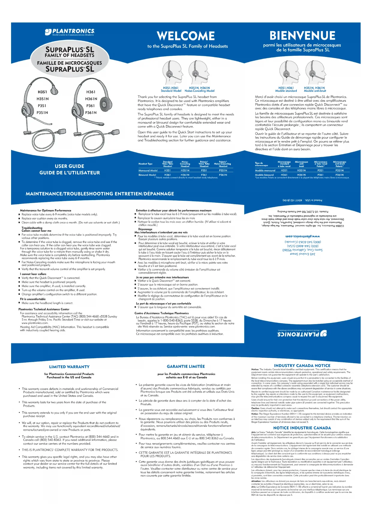 for Plantronics Commercial ProductsPurchased in the US and Canada • This warranty covers defects in materials and workmanship of Commercial Products manufactured, sold or certified by Plantronics which were purchased and used in the United States and Canada. • This warranty lasts for two years from the date of purchase of the Products.• This warranty extends to you only if you are the end user with the original purchase receipt.• We will, at our option, repair or replace the Products that do not conform to the warranty. We may use functionally equivalent reconditioned/refurbished/ remanufactured/pre-owned or new Products or parts. • To obtain service in the U.S. contact Plantronics at (800) 544-4660 and in Canada call (800) 540-8363. If you need additional information, please contact our service centers at the numbers provided.• THIS IS PLANTRONICS’ COMPLETE WARRANTY FOR THE PRODUCTS. • This warranty gives you specific legal rights, and you may also have other rights which vary from state to state or province to province. Please contact your dealer or our service center for the full details of our limited warranty, including items not covered by this limited warranty.pour les Produits commerciaux Plantronicsachetés aux É-U et au Canada• La présente garantie couvre les vices de fabrication (matériaux et main d’œuvre) des Produits commerciaux fabriqués, vendus ou certifiés par Plantronics lorsque ces Produits ont été achetés et utilisés aux États-Unis et au Canada.• La période de garantie dure deux ans à compter de la date d’achat des Produits.• La garantie vous est accordée exclusivement si vous êtes l’utilisateur final en possession du reçu de caisse original.• Nous réparerons ou remplacerons, au choix, les Produits non conformes à la garantie. Nous pourrons utiliser des pièces ou des Produits neufs, d’occasion, remanufacturés/rénovés/reconditionnés fonctionnellement équivalents.• Pour mettre la garantie en jeu et obtenir du service, téléphoner à Plantronics, au 800.544.4660 aux É-U et au 800.540.8363 au Canada.• Pour tous renseignements complémentaires, veuillez contacter nos centres de service aux numéros fournis.• CETTE GARANTIE EST LA GARANTIE INTÉGRALE DE PLANTRONICS POUR LES PRODUITS. • Cette garantie vous donne des droits juridiques spécifiques et vous pouvez aussi bénéficier d’autres droits, variables d’un État ou d’une Province à l’autre. Veuillez contacter votre distributeur ou notre centre de service pour tous les détails concernant notre garantie limitée, notamment les articles non couverts par cette garantie limitée.