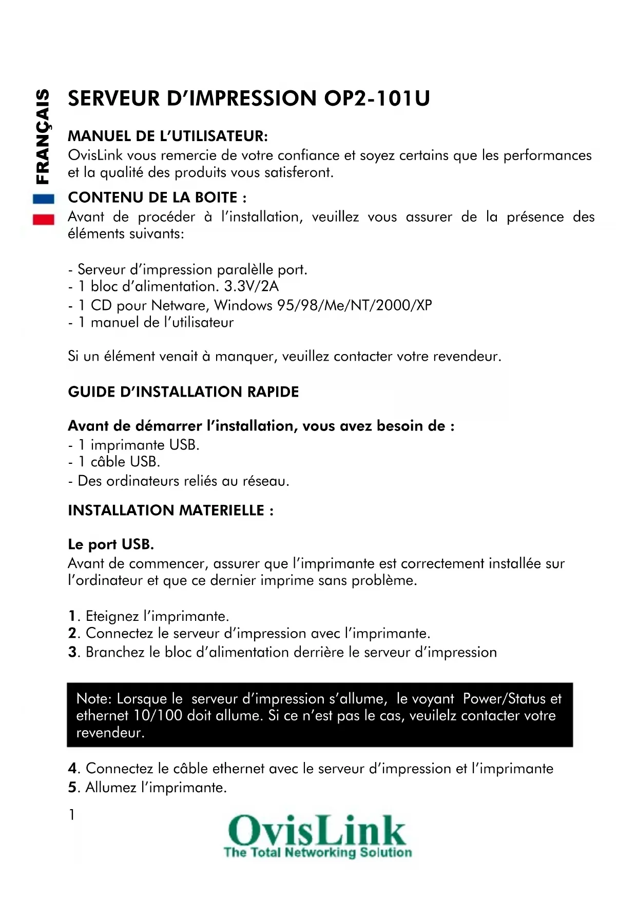 MANUEL DE L’UTILISATEUR: OvisLink vous remercie de votre confiance et soyez certains que les performances et la qualité des produits vous satisferont. CONTENU DE LA BOITE : Avant de procéder à l’installation, veuillez vous assurer de la présence des éléments suivants: - Serveur d’impression paralèlle port. - 1 bloc d’alimentation. 3.3V/2A - 1 CD pour Netware, Windows 95/98/Me/NT/2000/XP - 1 manuel de l’utilisateur Si un élément venait à manquer, veuillez contacter votre revendeur.