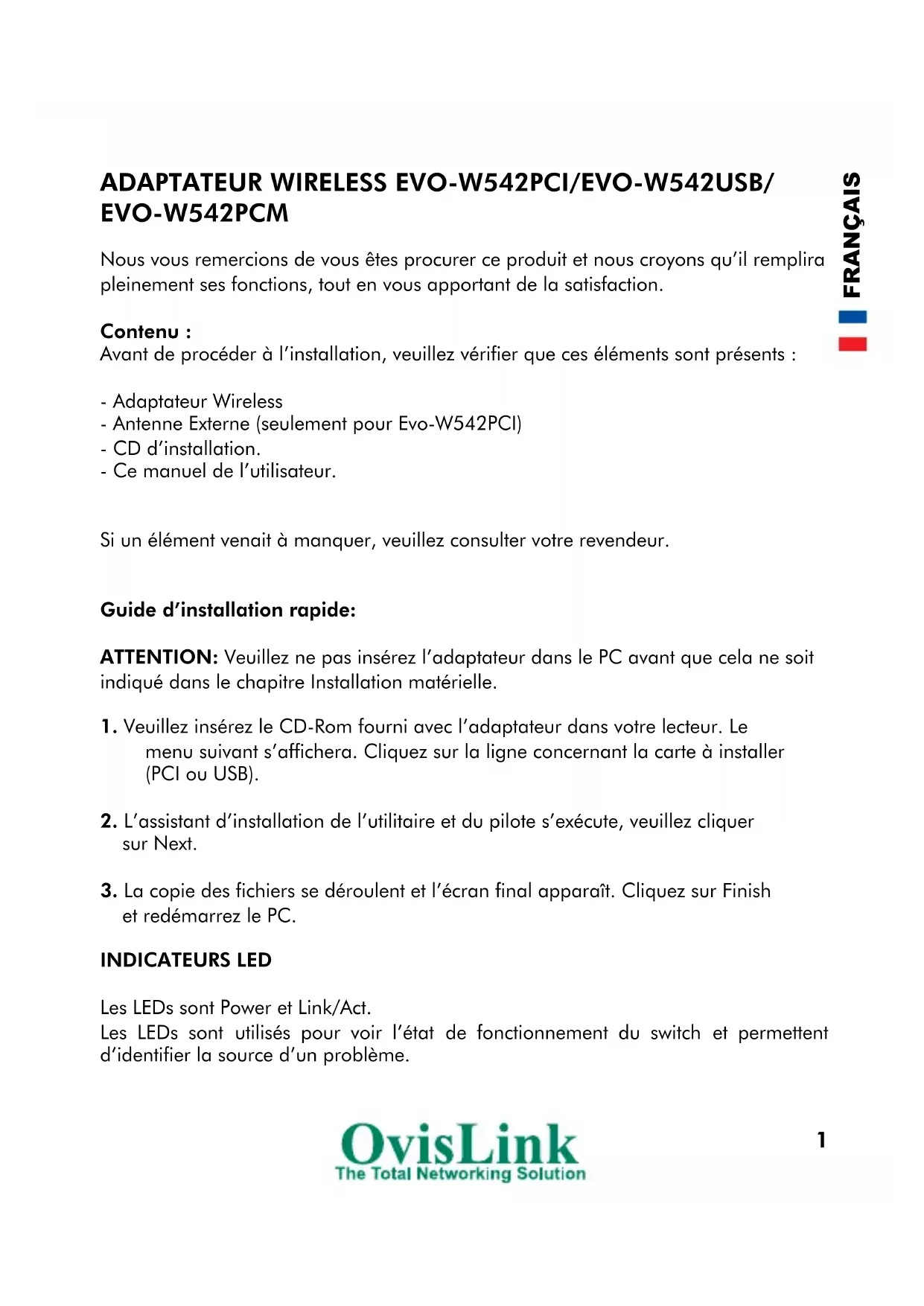 FRANÇAISDECLARATION DE CONFORMITE : Par la présente, OvisLink déclare que le EVO-W542PCI/EVO-W542USB/EVO-W542PCM est conforme avec les caractéristiques essentielles de la directive 1999/5/EC. L’importateur/fabricant suivant est responsable de cette déclaration de conformité : Société: OvisLink SA Adresse: 16-18 Route de ROUEN, 27950 SAINT-MARCEL. France. Site internet: www.ovislink.fr Nom: Horia SCURTU Fonction: Gérant. Date: 25 10 2008 Signature: GARANTIE. Conditions de Garantie pour la France. Ce produit a passé les rigoureux contrôles de qualité, qui garantissent que le matériel fonctionne correctement, sans défauts de fabrication et qui permettra d’obtenir des performances élevées. Ce produit est garanti à vie et dans le cas où vous rencontreriez un quelconque défaut de fabrication ou de fonctionnement, il vous sera échanger contre un produit fonctionnel, neuf ou réparé, équivalent ou supérieur en caractéristiques. Pour connaître la procédure d’échange, prenez contact avec votre revendeur. La présente Garantie ne peut s’appliquer lors d’un dégât normal, de dégâts dûs à une mauvaise utilisation ou manipulation par une personne non qualifiée ou de l’évolution de produits tiers entraînant une incompatibilité. OvisLink ne sera pas responsable des dommages causés sur ce produit par un usage incorrecte. Pour plus d’informations, prenez contact avec OvisLink :