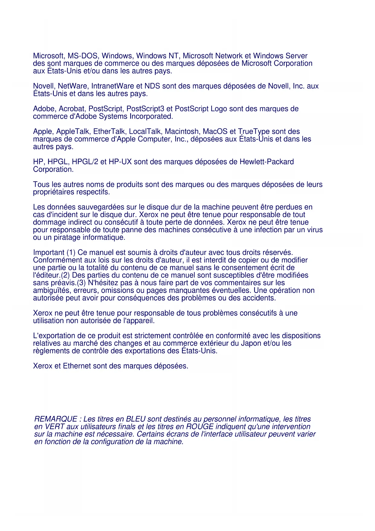 Guide d'utilisation rapide WorkCentre 7228/7235/7245 701P44879REMARQUE : Les titres en BLEU sont destinés au personnel informatique, les titres en VERT aux utilisateurs finals et les titres en ROUGE indiquent qu'une intervention sur la machine est nécessaire. Certains écrans de l'interface utilisateur peuvent varier en fonction de la configuration de la machine. Microsoft, MS-DOS, Windows, Windows NT, Microsoft Network et Windows Server des sont marques de commerce ou des marques déposées de Microsoft Corporation aux États-Unis et/ou dans les autres pays. Novell, NetWare, IntranetWare et NDS sont des marques déposées de Novell, Inc. aux États-Unis et dans les autres pays. Adobe, Acrobat, PostScript, PostScript3 et PostScript Logo sont des marques de commerce d'Adobe Systems Incorporated. Apple, AppleTalk, EtherTalk, LocalTalk, Macintosh, MacOS et TrueType sont des marques de commerce d'Apple Computer, Inc., déposées aux États-Unis et dans les autres pays. HP, HPGL, HPGL/2 et HP-UX sont des marques déposées de Hewlett-Packard Corporation. Tous les autres noms de produits sont des marques ou des marques déposées de leurs propriétaires respectifs. Les données sauvegardées sur le disque dur de la machine peuvent être perdues en cas d'incident sur le disque dur. Xerox ne peut être tenue pour responsable de tout dommage indirect ou consécutif à toute perte de données. Xerox ne peut être tenue pour responsable de toute panne des machines consécutive à une infection par un virus ou un piratage informatique. Important (1) Ce manuel est soumis à droits d'auteur avec tous droits réservés. Conformément aux lois sur les droits d'auteur, il est interdit de copier ou de modifier une partie ou la totalité du contenu de ce manuel sans le consentement écrit de l'éditeur.(2) Des parties du contenu de ce manuel sont susceptibles d'être modifiées sans préavis.(3) N'hésitez pas à nous faire part de vos commentaires sur les ambiguïtés, erreurs, omissions ou pages manquantes éventuelles. Une opération non autorisée peut avoir pour conséquences des problèmes ou des accidents. Xerox ne peut être tenue pour responsable de tous problèmes consécutifs à une utilisation non autorisée de l'appareil. L'exportation de ce produit est strictement contrôlée en conformité avec les dispositions relatives au marché des changes et au commerce extérieur du Japon et/ou les règlements de contrôle des exportations des États-Unis. Xerox et Ethernet sont des marques déposées.WorkCentre 7228/7235/7245 WorkCentre 7228/7235/7245 Guide d'utilisation rapide Table des matières Panneau de commande Impression d'un relevé de configuration