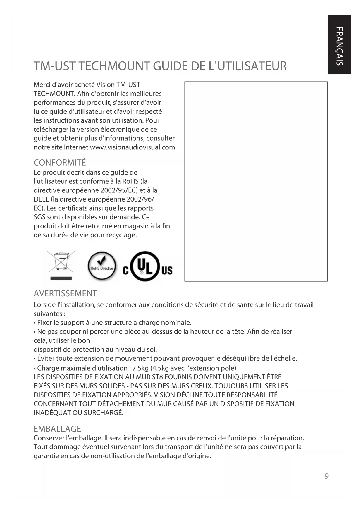 CONFORMITÉ Le produit décrit dans ce guide de l'utilisateur est conforme à la RoHS (la directive européenne 2002/95/EC) et à la DEEE (la directive européenne 2002/96/ EC). Les certicats ainsi que les rapports SGS sont disponibles sur demande. Ce produit doit être retourné en magasin à la n de sa durée de vie pour recyclage. Merci d'avoir acheté Vision TM-UST TECHMOUNT. An d'obtenir les meilleures performances du produit, s'assurer d'avoir lu ce guide d'utilisateur et d'avoir respecté les instructions avant son utilisation. Pour télécharger la version électronique de ce guide et obtenir plus d'informations, consulter notre site Internet www.visionaudiovisual.com AVERTISSEMENT Lors de l'installation, se conformer aux conditions de sécurité et de santé sur le lieu de travail suivantes :