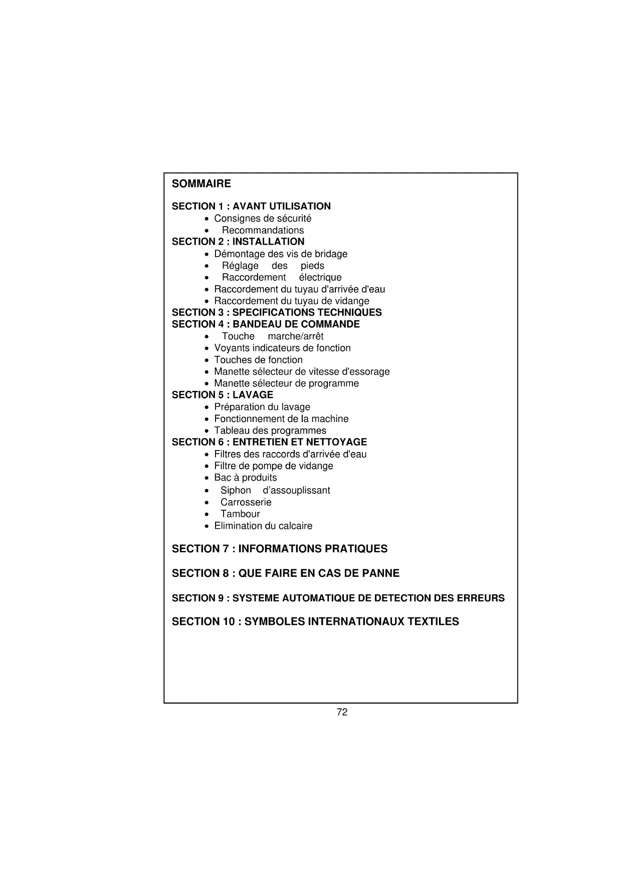 SECTION 7 : INFORMATIONS PRATIQUES SECTION 8 : QUE FAIRE EN CAS DE PANNE SECTION 9 : SYSTEME AUTOMATIQUE DE DETECTION DES ERREURS SECTION 10 : SYMBOLES INTERNATIONAUX TEXTILES