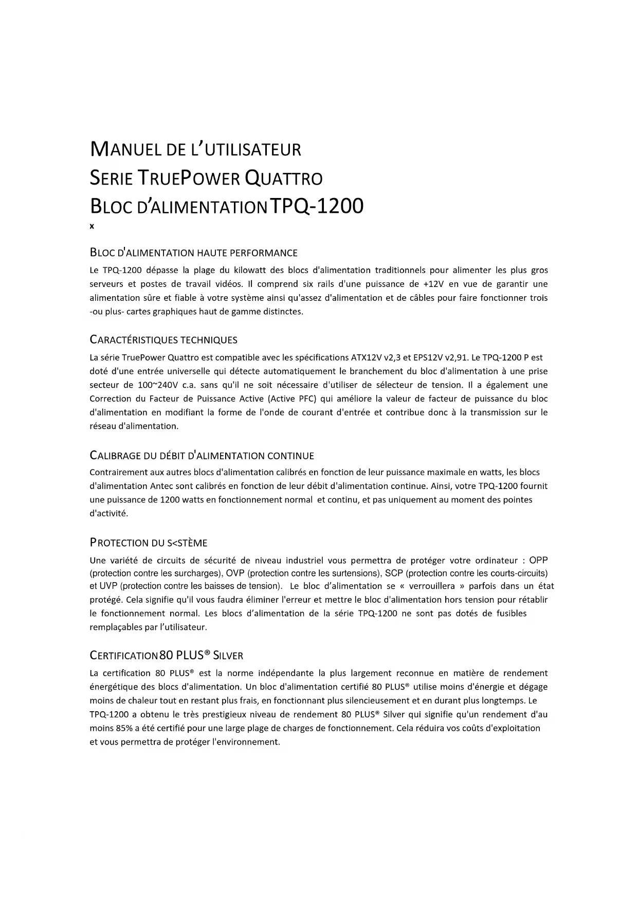 Quattro 1200 - Alimentation PC ANTEC - Notice d'utilisation et mode d'emploi gratuit