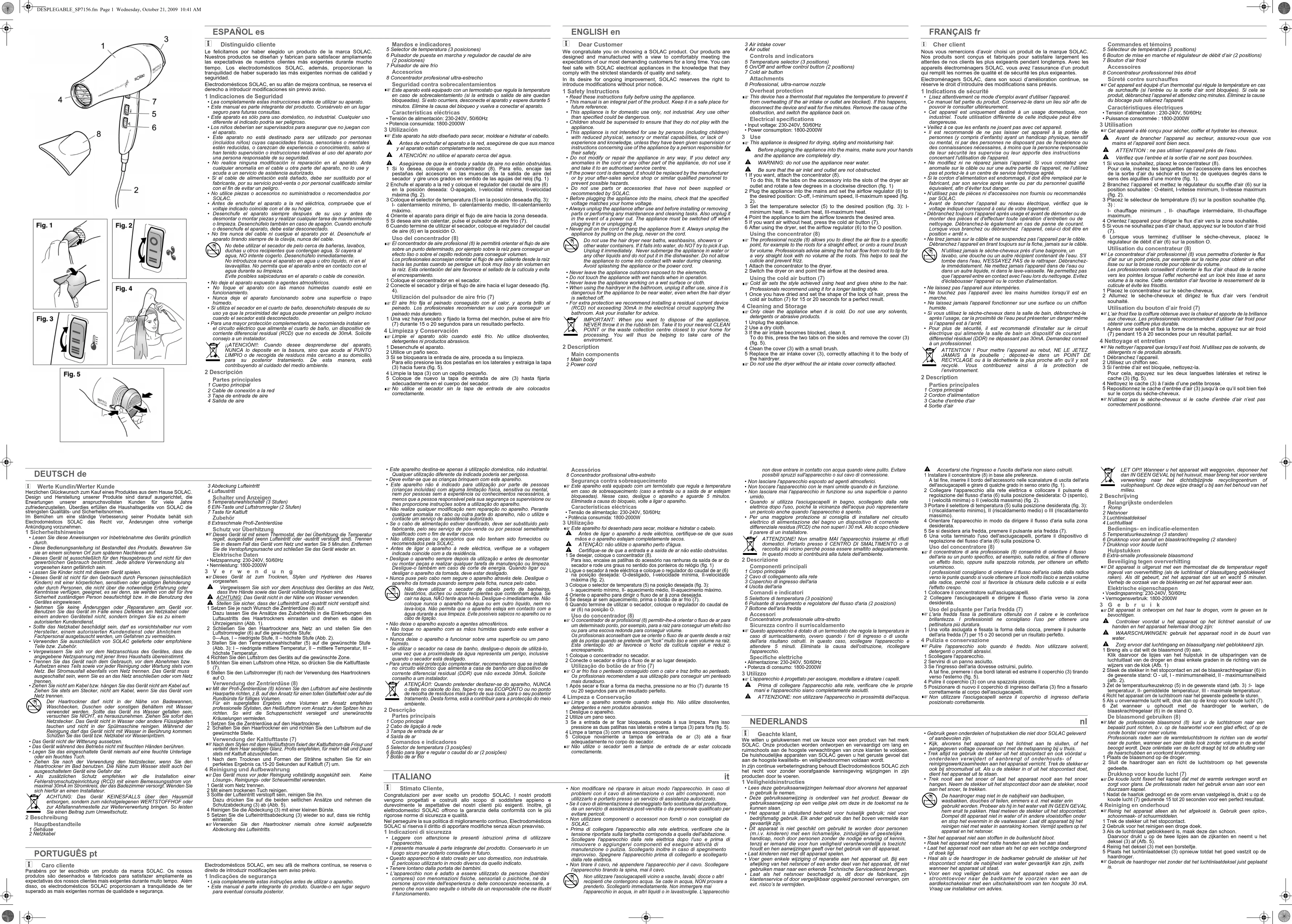 This appliance is designed for drying, styling and moisturising hair. ‹ Before plugging the appliance into the mains, make sure your hands and the appliance are completely dry. ‹ WARNING: do not use the appliance near water. ‹ Be sure that the air inlet and outlet are not obstructed. 1 If you want, attach the concentrator (8).To do this, fit the tabs on the accessory into the slots of the dryer airoutlet and rotate a few degrees in a clockwise direction (fig. 1)2 Plug the appliance into the mains and set the airflow regulator (6) tothe desired position: O-off, I-minimum speed, II-maximum speed (fig. 2). 3 Set the temperature selector (5) to the desired position (fig. 3): I-minimum heat, II- medium heat, III-maximum heat.4 Point the appliance to aim the airflow towards the desired area.5 If you want air without heat, press the cold air button (7).6 After using the dryer, set the airflow regulator (6) to the O position.Using the concentrator (8) The professional nozzle (8) allows you to direct the air flow to a specificpoint, for example to the roots for a straight effect, or onto a round brushfor volume. Professionals advise aiming the hot air flow from root to tip fora very straight look with no volume at the roots. This helps to seal thecuticle and prevent frizz.1 Attach the concentrator to the dryer.2 Switch the dryer on and point the airflow at the desired area.Using the cold air button (7) Cold air sets the style achieved using heat and gives shine to the hair.Professionals recommend using it for a longer lasting style.1 Once you have dried and set the shape of the lock of hair, press thecold air button (7) for 15 or 20 seconds for a perfect result.4 Cleaning and Storage Only clean the appliance when it is cold. Do not use any solvents,detergents or abrasive products.1 Unplug the appliance.2 Use a dry cloth.3 If the air intake becomes blocked, clean it. To do this, press the two tabs on the sides and remove the cover (3)(fig. 5).4 Clean the cover (3) with a small brush.5 Replace the air intake cover (3), correctly attaching it to the body ofthe hairdryer. Do not use the dryer without the air intake cover correctly attached. FRANÇAIS fr i Cher client Nous vous remercions d’avoir choisi un produit de la marque SOLAC.Nos produits sont conçus et fabriqués pour satisfaire largement lesattentes de nos clients les plus exigeants pendant longtemps. Avec lesappareils électroménagers SOLAC, vous avez l’assurance d’un produitqui remplit les normes de qualité et de sécurité les plus exigeantes.Electroménagers SOLAC, dans son souci d’amélioration continue, seréserve le droit d’introduire des modifications sans préavis.1 Indications de sécurité